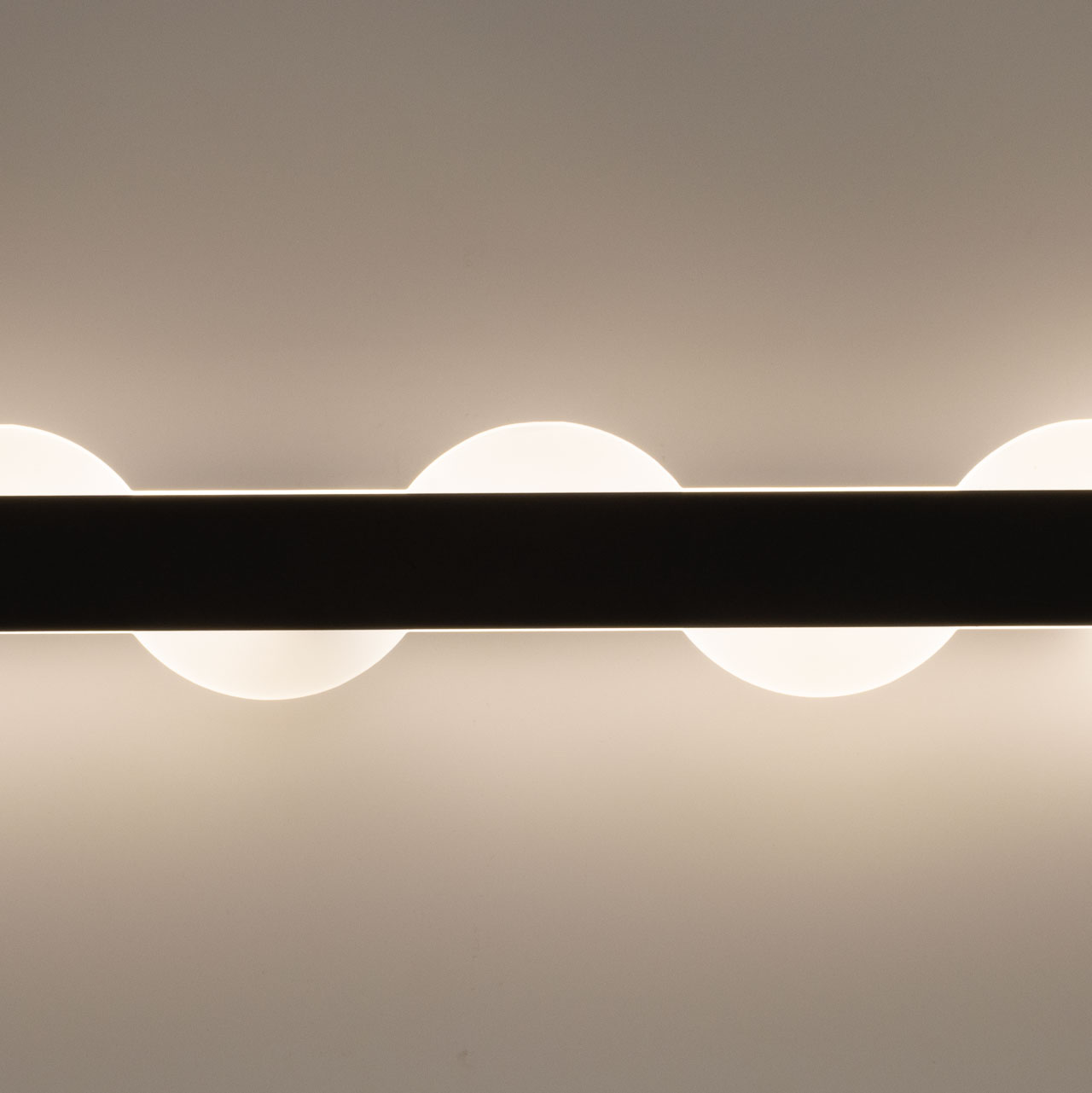 Металлическое основание потолочного светильника окрашено в черный цвет. Светодиодные источники света закрыты матовым акрилом. Светильник декорирован элементами из матового акрила.