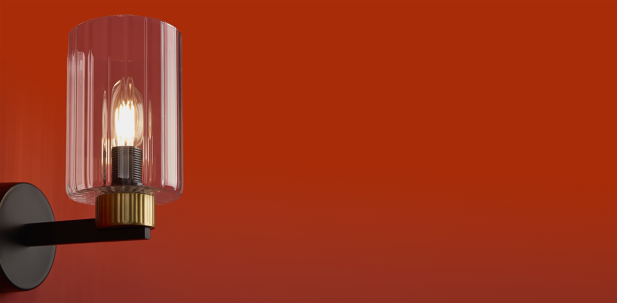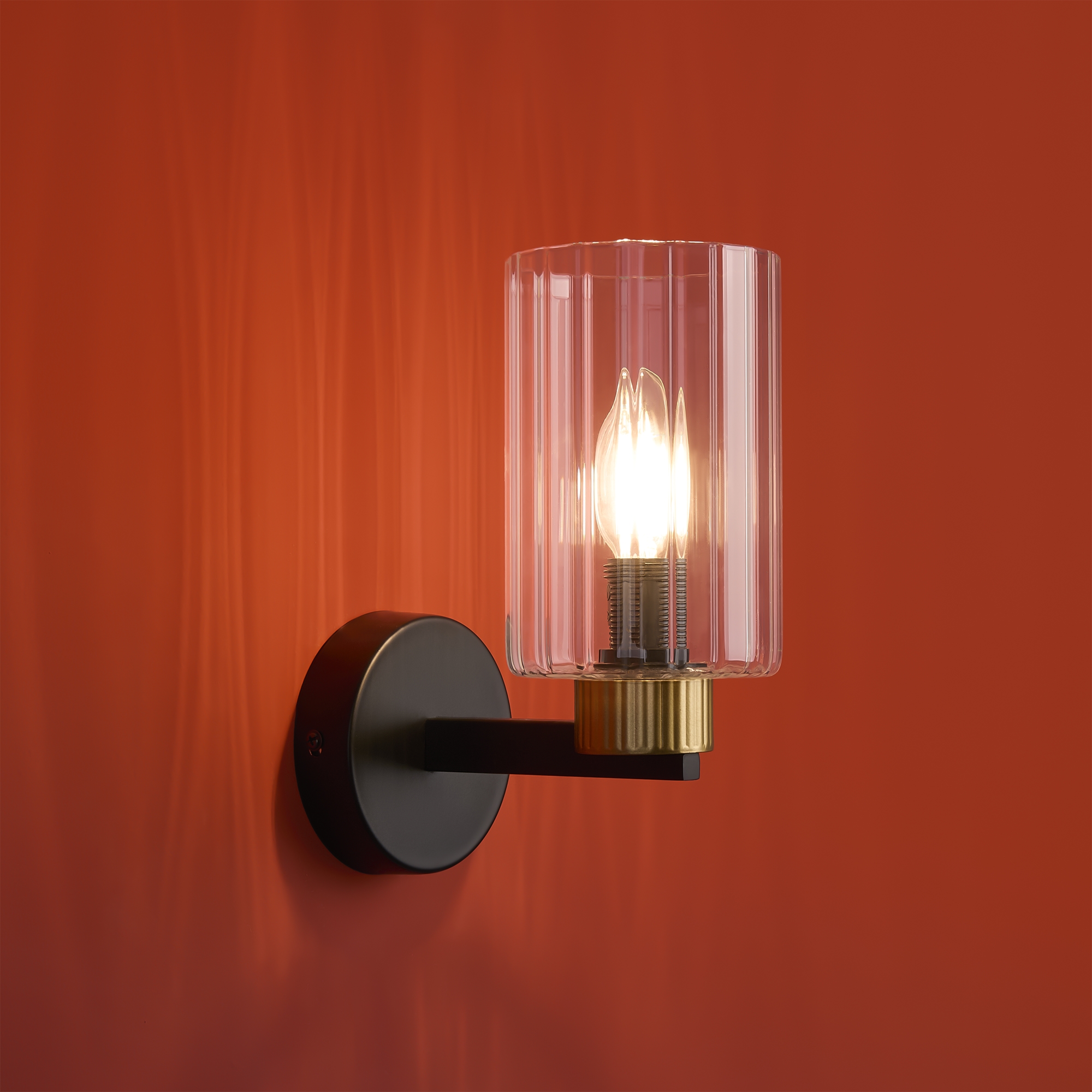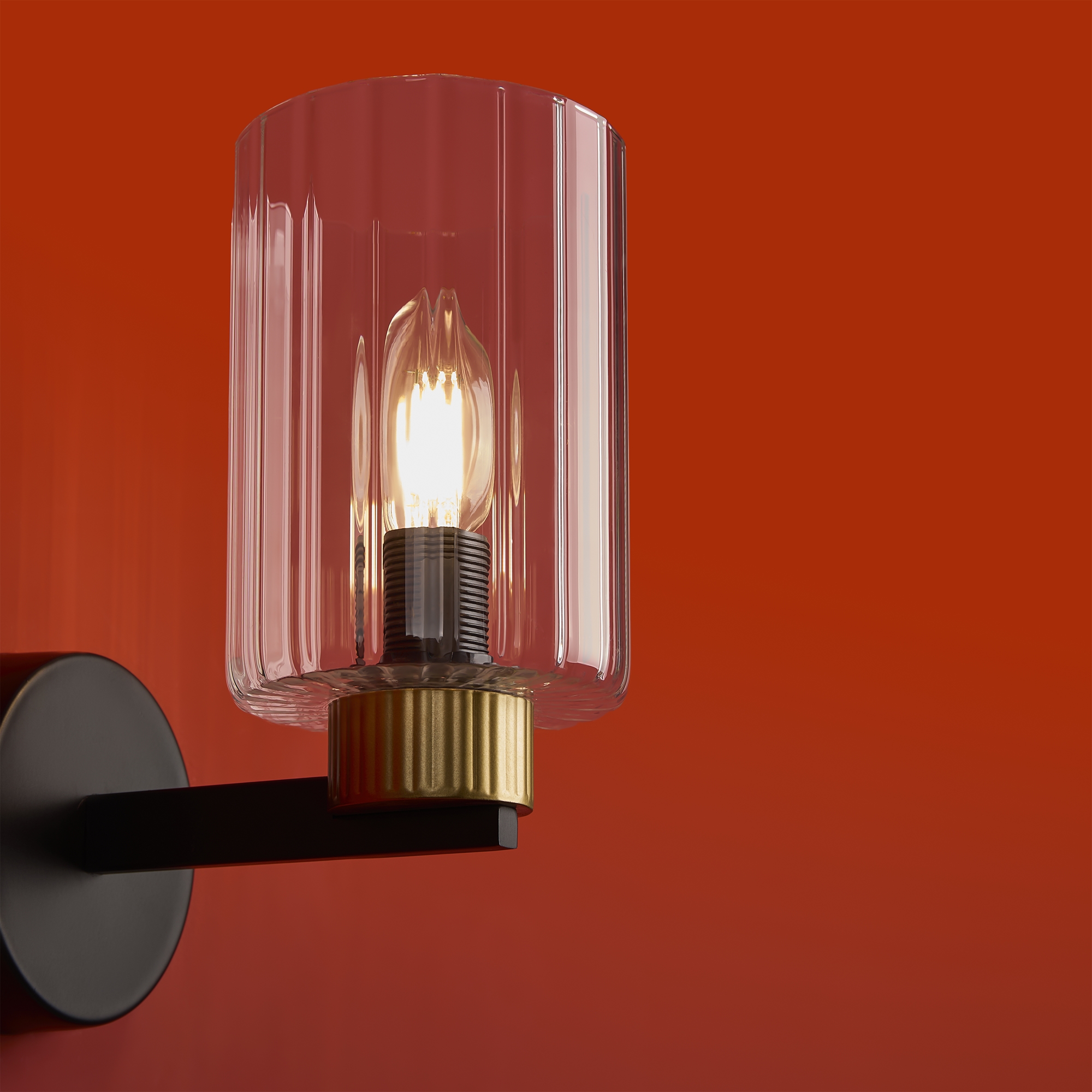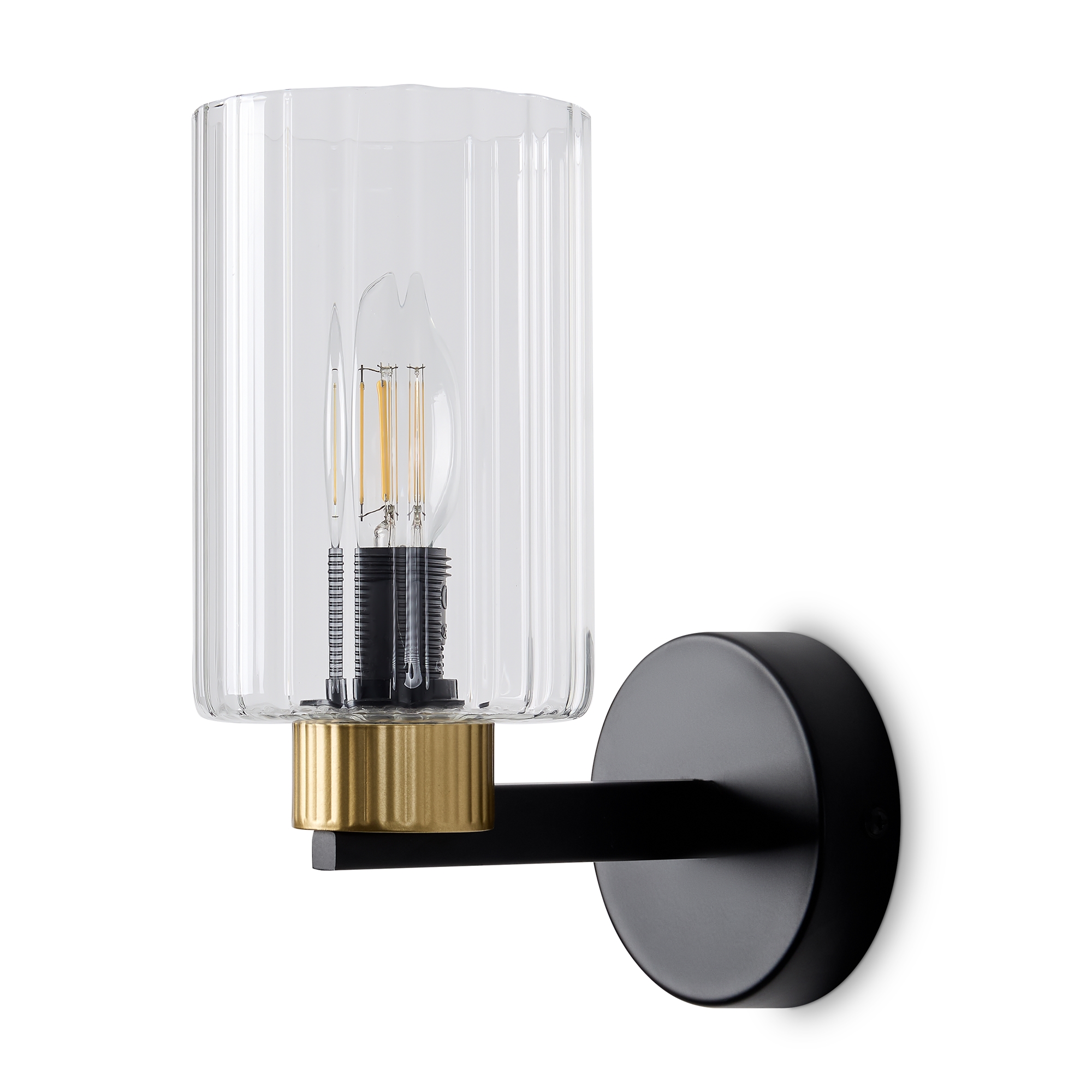 Металлическая арматура чёрного матового цвета с латунными вставками. Прозрачные цилиндрические стеклянные абажуры. Лампы E14 (не включены). Трендовое сочетание для современных интерьеров.