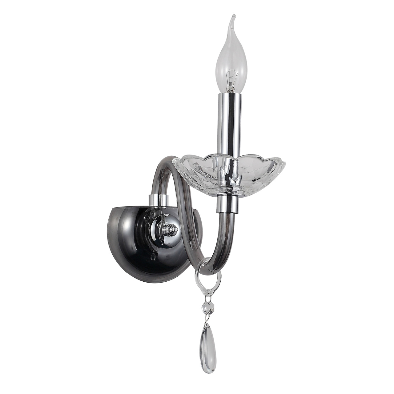 Металлическое основание гальванизировано в цвет хрома и закрыто стеклом ручной работы, гальванизированным в дымчатый цвет. Декоративная розетка отлита из прозрачного стекла в сложную форму. Светильник декорирован прозрачным хрусталем формы октагон и стеклом формы миндаля.
