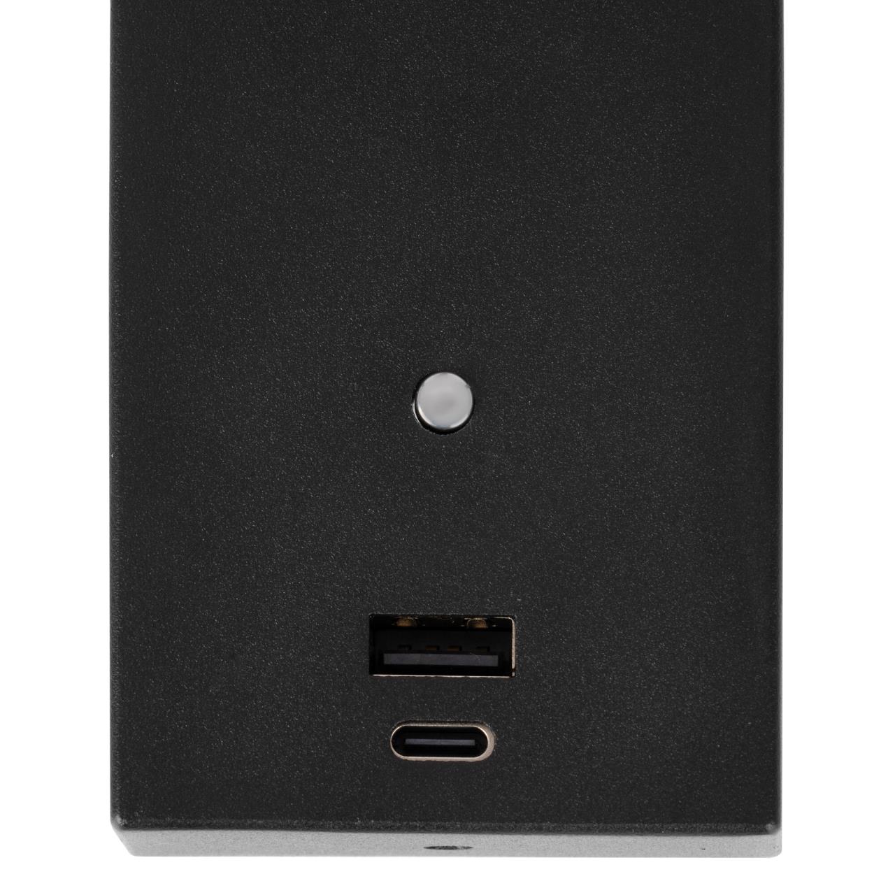 Мощность изделия 3Вт, световой поток 225Лм, цветовая температура 3000К – теплый свет. На корпусе расположен удобный выключатель и зарядное устройство для мобильных гаджетов, разъёмы USB и Type-C, ток зарядки 2А.