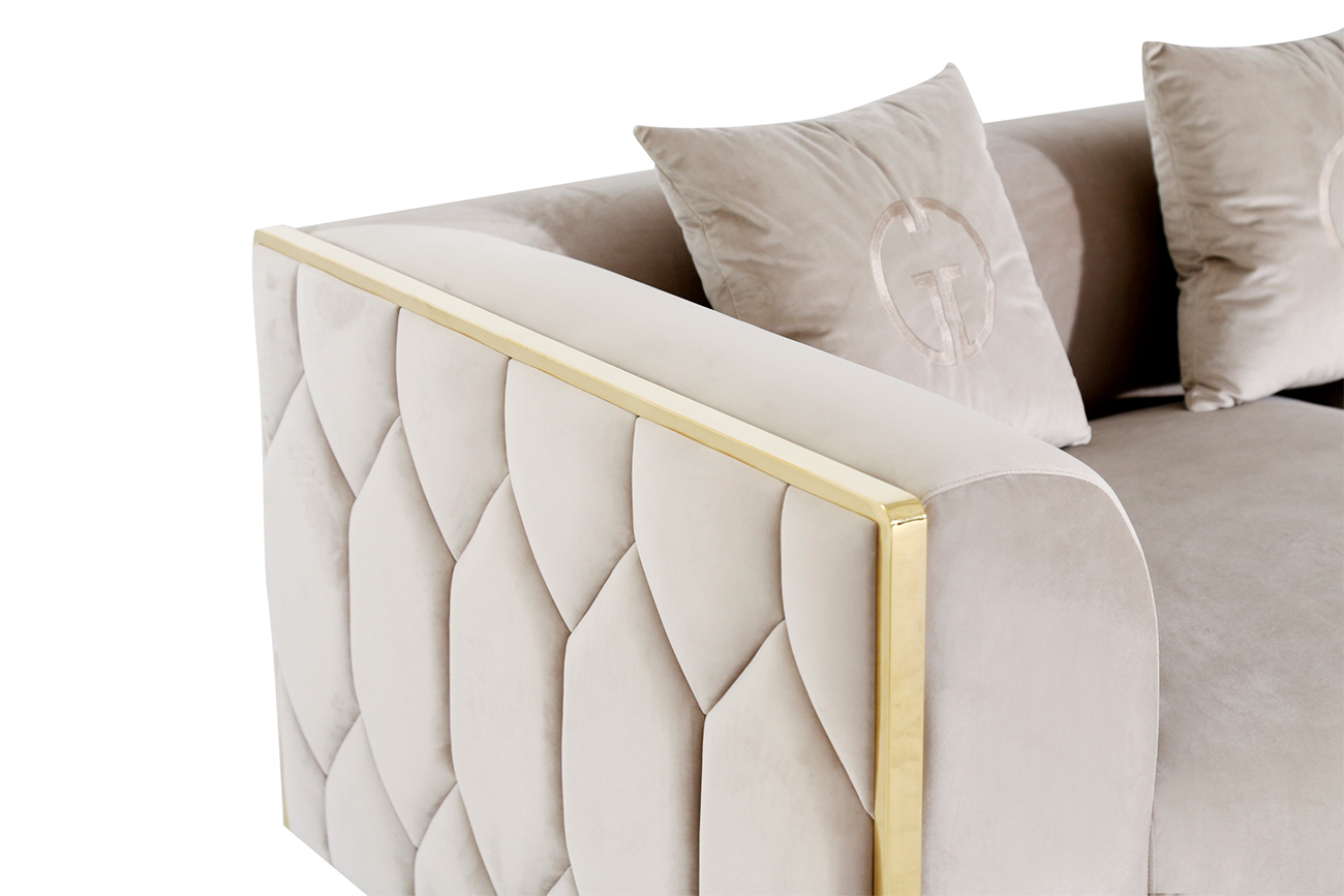 Стильный двухместный диван BERN – роскошная мягкая мебель с элегантным дизайном и декоративными подушками. Особенного очарования и эксклюзивности модели придает каркас из металла с дорогим золотым блеском. Мягкая спинка и широкие подлокотники гарантируют максимальный комфорт, а нежная велюровая ткань в качестве обивки отвечает за люксовую эстетику. В качестве материала каркаса выбрано натуральное дерево. Бежевый диван в интерьере гостиной выглядит всегда уместно и гармонично сочетается с другой мебелью. Он подойдет как для жилого, так и для бизнес-интерьера. В каталоге также представлены трехместный диван из этой же серии и кресло LOCARNO, которые составят стильный мягкий комплект мебели.