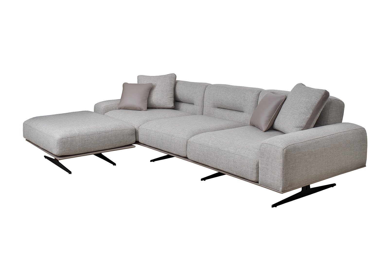 Комплект мебели №11 диван модульный PORTO (левый угол). В состав комплекта входит: основание трехместное-1шт, выполнена в иск.коже Enzo902; подлокотник низкий-2шт; сиденье с высокой спинкой-3шт; отдельностоящий пуф- 1шт. Основная ткань комплекта- рогожка Norton SER из коллекции тканей . В сотав комплекта входят декоративные подушки: 50*50см с бурлетом 2шт- в ткани Norton SER. бурлет- иск.кожа Enzo902; 40*40см с кантом 2шт- в иск.коже Enzo 902. Металлические опоры- 170см, цвет черный. Габариты комплекта: ширина-294см, глубина- 194см, высота-75см. Глубина пуфа- 107см, глубина посадочного места- 82см, высота посадочного места- 45см