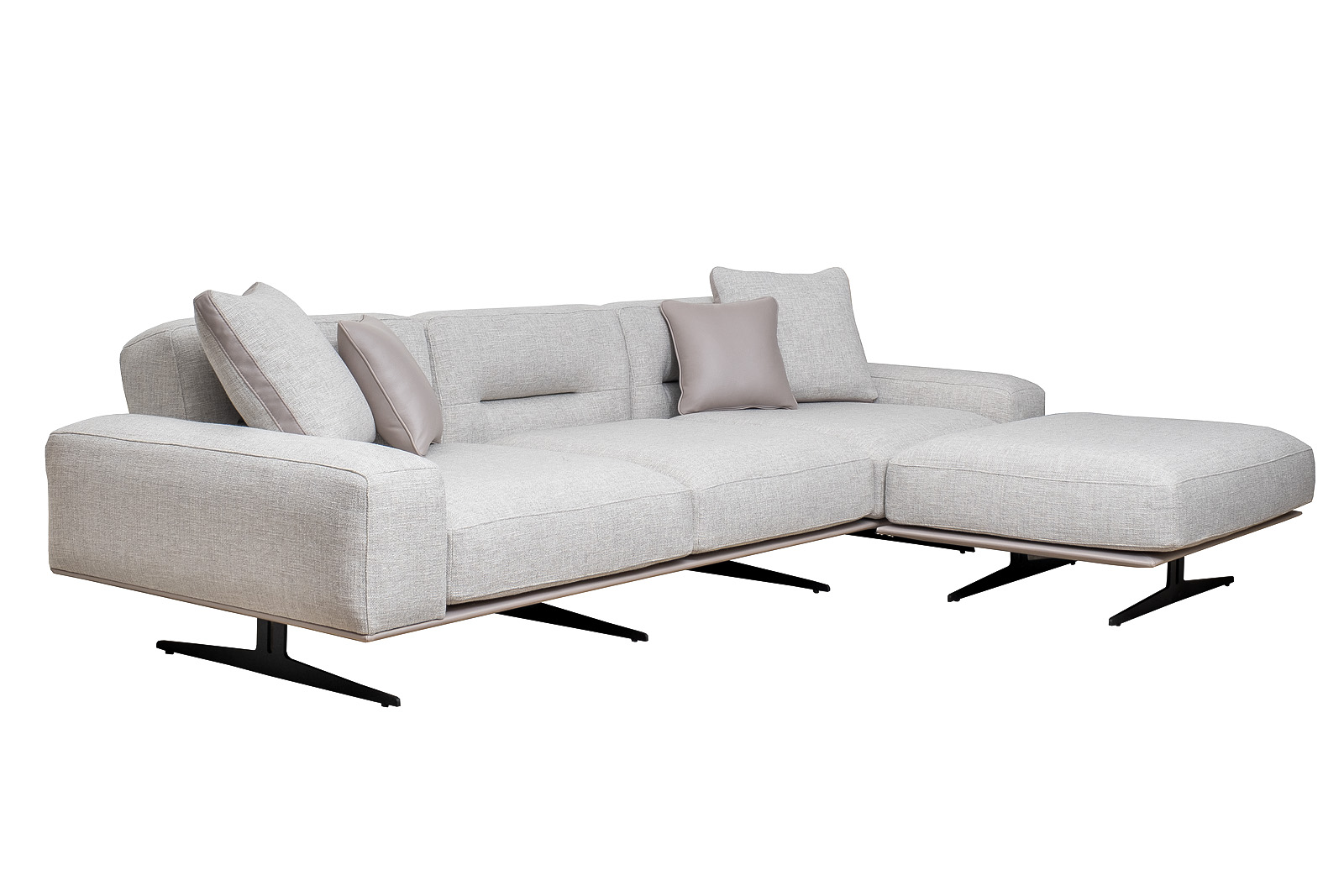 Комплект мебели №12 диван модульный PORTO (правый угол). В состав комплекта входит: основание трехместное-1шт, выполнена в иск.коже Enzo902; подлокотник низкий-2шт; сиденье с высокой спинкой-3шт; отдельностоящий пуф- 1шт. Основная ткань комплекта- рогожка Norton SER из коллекции тканей Garda Decor. В сотав комплекта входят декоративные подушки: 50*50см с бурлетом 2шт- в ткани Norton SER. бурлет- иск.кожа Enzo902; 40*40см с кантом 2шт- в иск.коже Enzo 902. Металлические опоры- 170см, цвет черный. Габариты комплекта: ширина-294см, глубина- 194см, высота-75см. Глубина пуфа- 107см, глубина посадочного места- 82см, высота посадочного места- 45см
