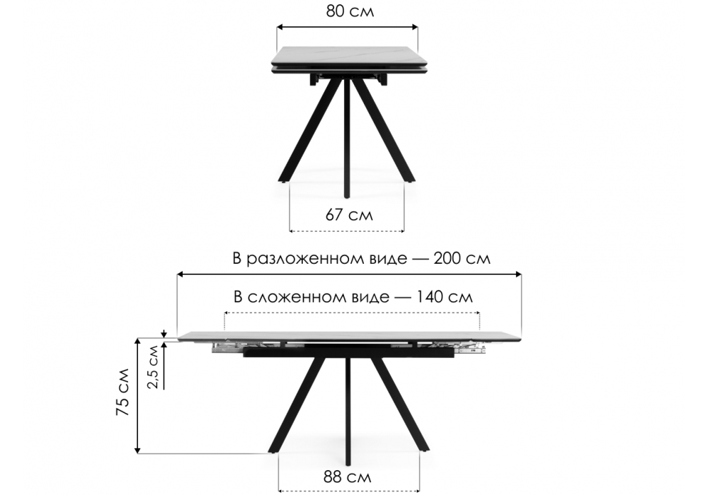 Материал каркаса - металл; Материал столешницы - Керамика; Ширина - 80; Высота - 75; Длина стола в разложенном виде - 200; Длина - 140;