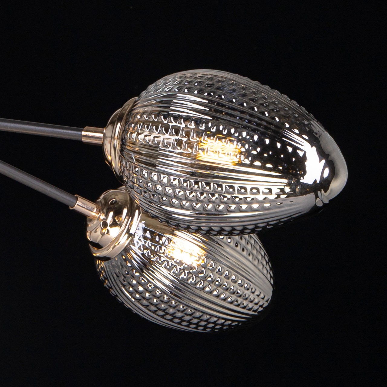 Металлическое основание потолочной люстры окрашено в цвет кофе. Отдельные элементы основания гальванизированы в цвет золота. Плафоны выполнены из фактурного стекла, отлитого в сложную форму и гальванизированного в дымчатый металлизированный цвет.