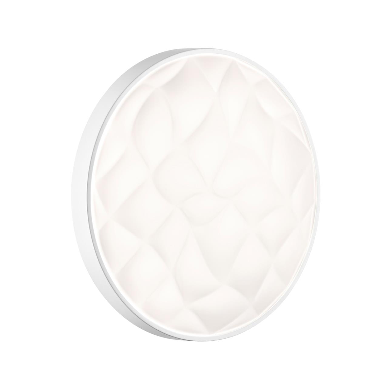 Светильник 7672/DL линии GITUM состоит из металлического основания (базы) и пластикового рассеивателя. Материал рассеивателя - высококачественный пластик марки PMMA 2.0 белого цвета с матовой поверхностью. Пластик обеспечивает светильнику равномерное рассеивание и хорошее светопропускание. Форма плафона: круглая, декорирована рельефной структурой и ободом из пластика белого цвета. Степень защиты IP43 позволяет использовать светильник в определенных зонах влажных помещений. В комплект входит заменяемый LED модуль с линзами, мощностью 48Вт, которая соответствует лампе накаливания 460Вт. Источник света имеет комфортную цветовую температуру 4000К (белый свет).
