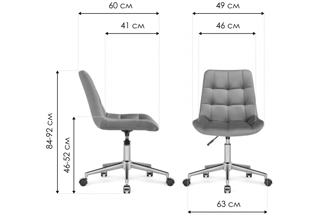 Материал каркаса - металл; Материал сиденья - велюр; Материал обивки - велюр; Ширина - 49; Глубина - 60; Высота - 84; Ширина сиденья - 46; Глубина сиденья - 41; Высота сиденья - 46; Высота спинки - 38; Высота максимальная - 92;