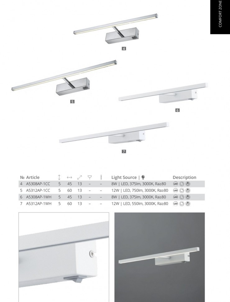 Подсветка для зеркал Arte Lamp A5308AP-1WH, входящая в серию Picture Lights Led, отлично подойдет для освещения пространства над зеркалом или картиной на кухне, на даче, в гардеробной, в прихожей, в кабинете, оформленных в современном стиле или в стиле Техно. Данный спот имеет один акриловый плафон матового белого цвета, выполненный в форме призмы и направленный вниз, вверх или в стороны, в зависимости от расположения на стене, а также белую арматуру, изготовленную из крашенного металла. Итальянский производитель Arte Lamp дает гарантию на свое изделие 1 год и обращает внимание на то, что осветительный элемент с цоколем LED встроен в конструкцию и не требует приобретения дополнительных лампочек, а общая мощность светильника составляет 8 Вт, что эквивалентно лампе накаливания мощностью 35 Вт и позволяет осветить помещение площадью 2 кв. м. Общий световой поток составляет 375 Лм, а индекс цветопередачи равен 80 Ra. Технической особенностью этого осветительного прибора является наличие выключателя на корпусе. Цветовая температура равна 3000 К, что делает атмосферу в вашем интерьере более уютной. Способ крепления подсветки к стене на планку позволяет быстро и просто осуществить монтаж светильника. Лаконичный дизайн, матовая белая поверхность арматуры и теплая цветовая температура подсветки для зеркал Arte Lamp A5308AP-1WH, делают ее особенным элементом декора, который украсит любое интерьерное пространство.