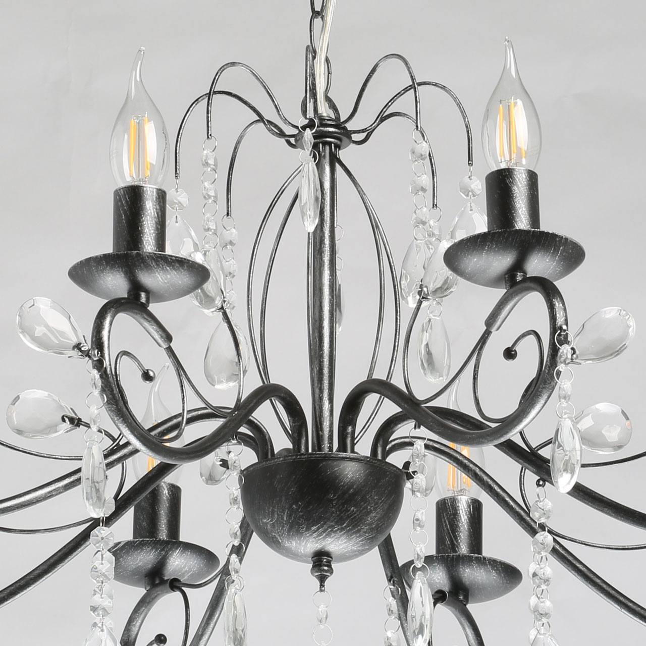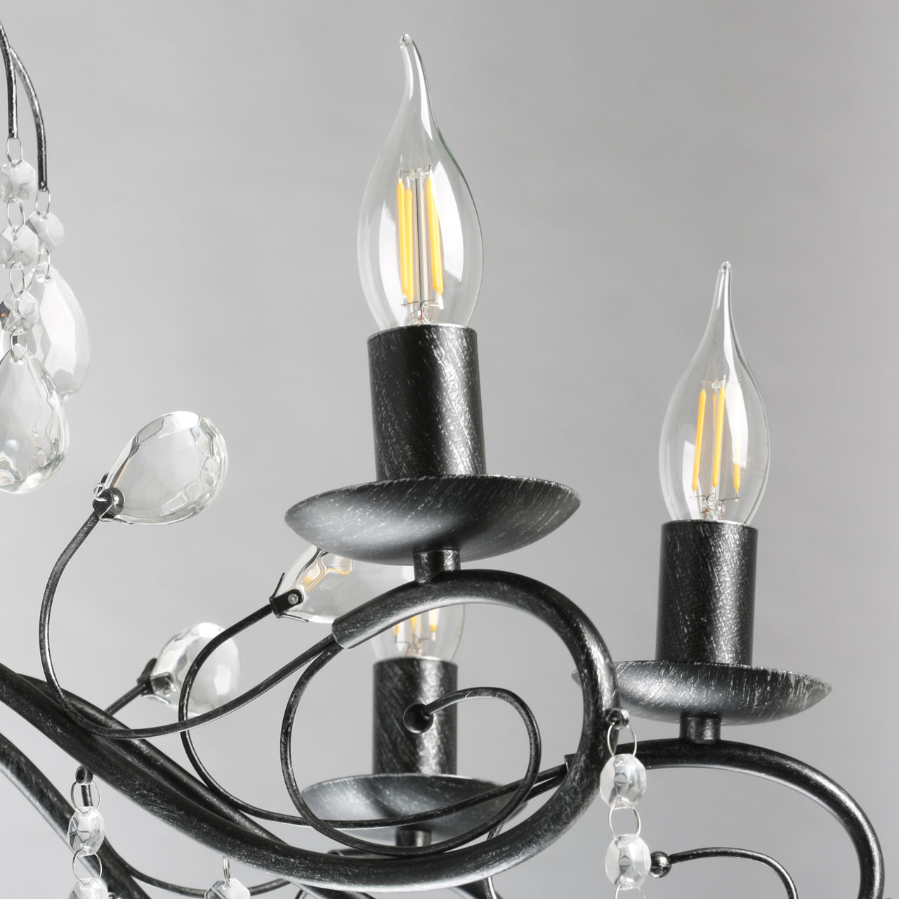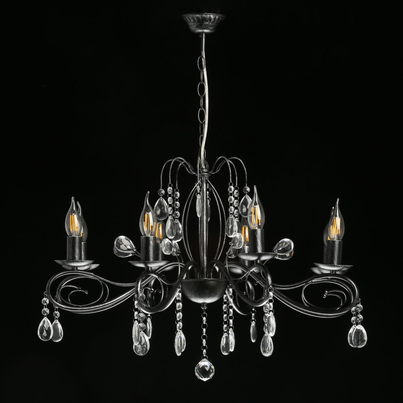 Металлическое основание светильника окрашено в черный цвет и обработано по технологии хай-лайт в серебряный цвет. Светильник декорирован стеклянными подвесами миндалевидной формы и хрусталем в форме шара.