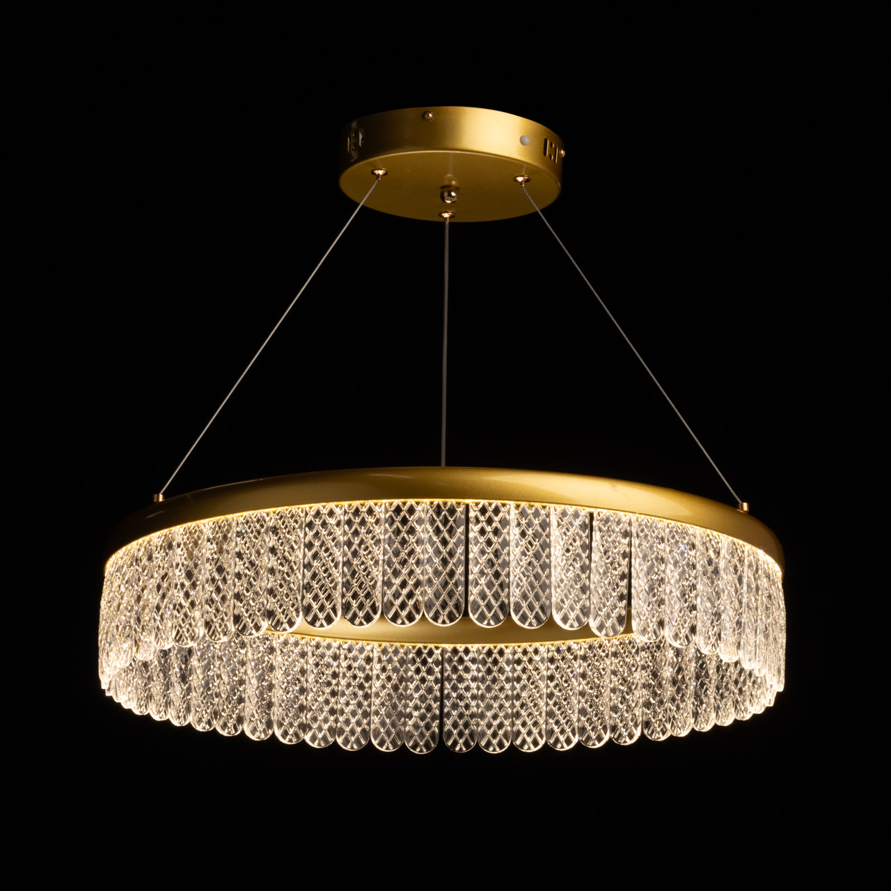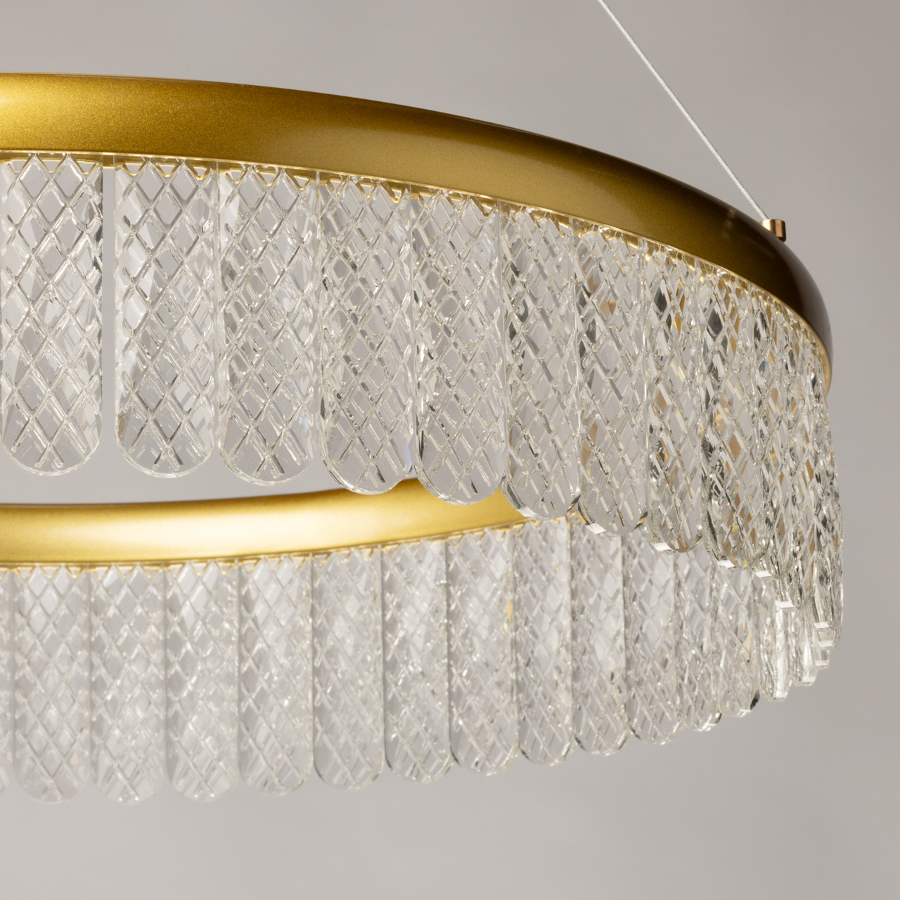 Светильник Орион подвешен на прочных металлических тросах, что создает эффект лёгкости и воздушности. Общая высота светильника составляет 90 см, и благодаря возможности регулировки, он прекрасно впишется в помещения как с высокими так и со стандартными потолками. Основание выполнено из качественного металла, который был гальванизирован в элегантный золотой цвет. Этот роскошный оттенок не только добавляет изделию изысканности, но и гармонично сочетается с различными стилями интерьера — от классического до современного минимализма.Светильник Орион оснащен современными светодиодами мощностью 58W, что обеспечивает яркое и эффективное освещение. Он способен осветить помещение площадью до 16 квадратных метров, что делает его идеальным решением для гостиных, кухонь или детских комнат. Кроме того, светильник оснащен пультом, который позволяет регулировать температуру света в диапазоне от 3000 до 6000 K. Это дает возможность создавать различные атмосферные эффекты в зависимости от времени суток или настроения, будь то уютный теплый свет для вечерних посиделок или яркий холодный свет для работы или учебы.Плафон светильника украшен подвесками из прозрачного хрусталя с необычными гранями, которые придают изделию дополнительную изысканность. Эти хрустальные элементы не только играют с светом, создавая красивые отражения, но и добавляют нотку роскоши в общий дизайн.Лаконичный и современный дизайн светильника Орион соответствует актуальным тенденциям в мире освещения. Простота форм и отсутствие лишних деталей делают его универсальным элементом, который легко вписывается в любой интерьер. Светильник может использоваться как самостоятельный источник света, так и в сочетании с другими осветительными приборами, создавая гармоничное освещение в пространстве.