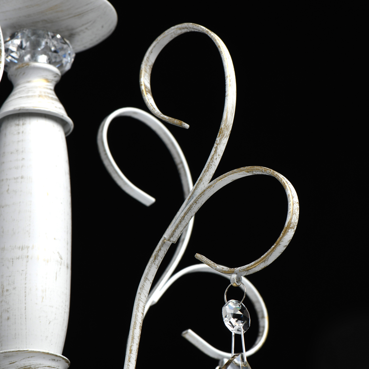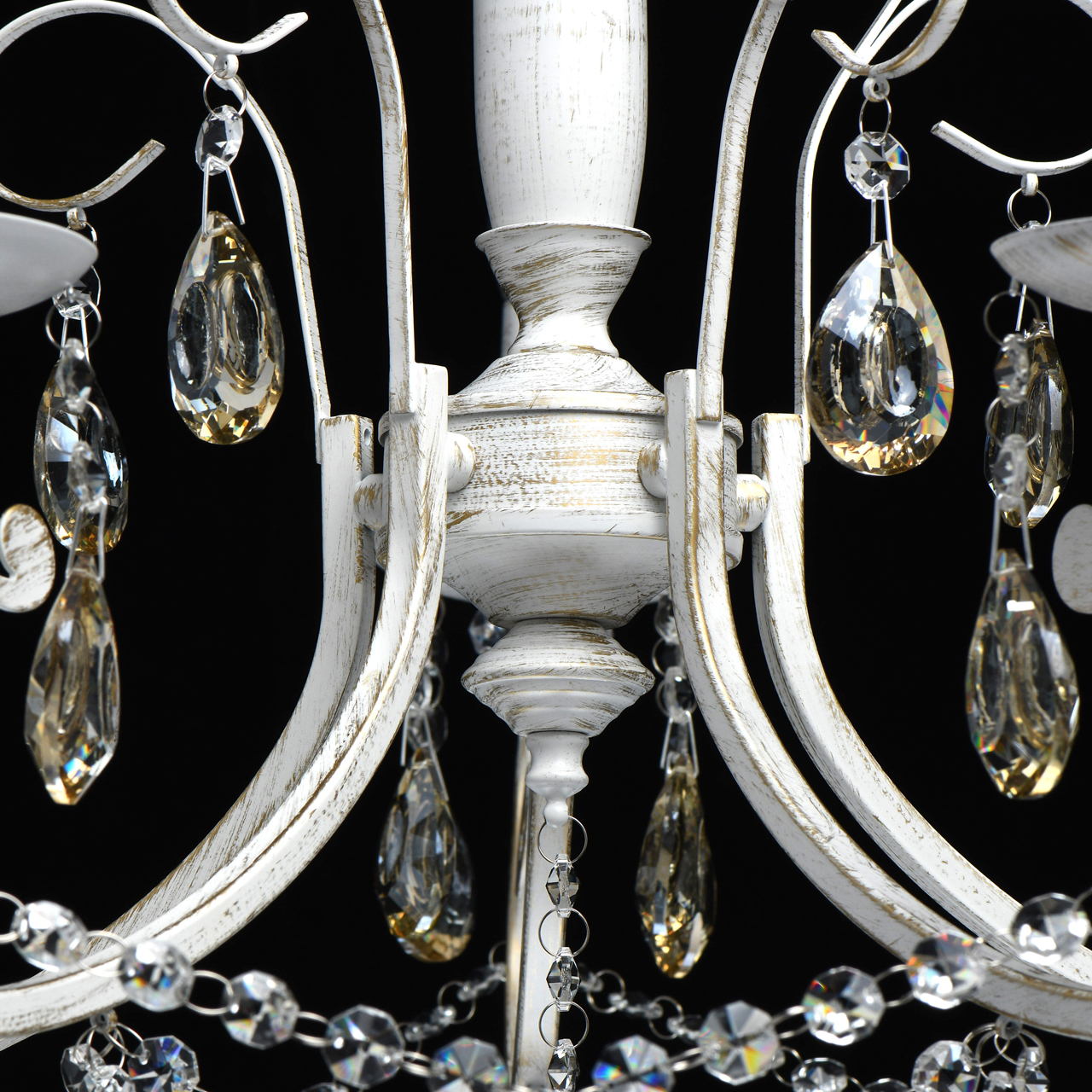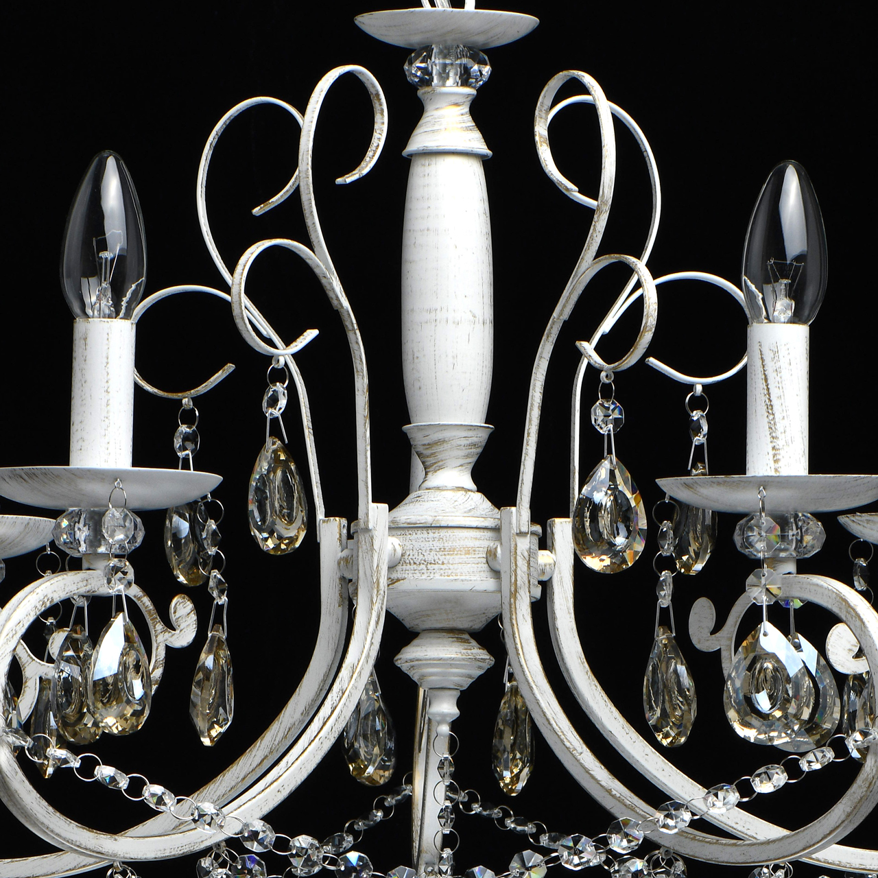 Металлическое основание обработано в технике хай-лайт: на белую основу нанесен слой золотого покрытия, что создает эффект старинного украшения. Люстра богато декорирована бусами из круглого хрусталя и подвесками из хрустальных октагонов оттенка шампань. Изысканность модели подчеркивают изящные рожки со множеством изгибов. Учитывая отсутствие плафонов, их роль выполняют лампы в форме свечей.