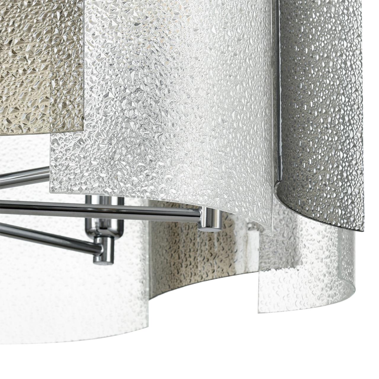 Линия DANDY - это стильный акцент в любом интерьере. Металлический каркас с хромированным покрытием идеально гармонирует с современным оформлением комнат. Плафоны из тонированного и матового белого стекла создают мягкое освещение, при этом добавляя эффект глубины и объема. Чередование вогнутых и выпуклых фактурных стеклянных пластин создает динамичный визуальный эффект, а хромированная подвесная цепочка добавляет конструкции легкости и элегантности.