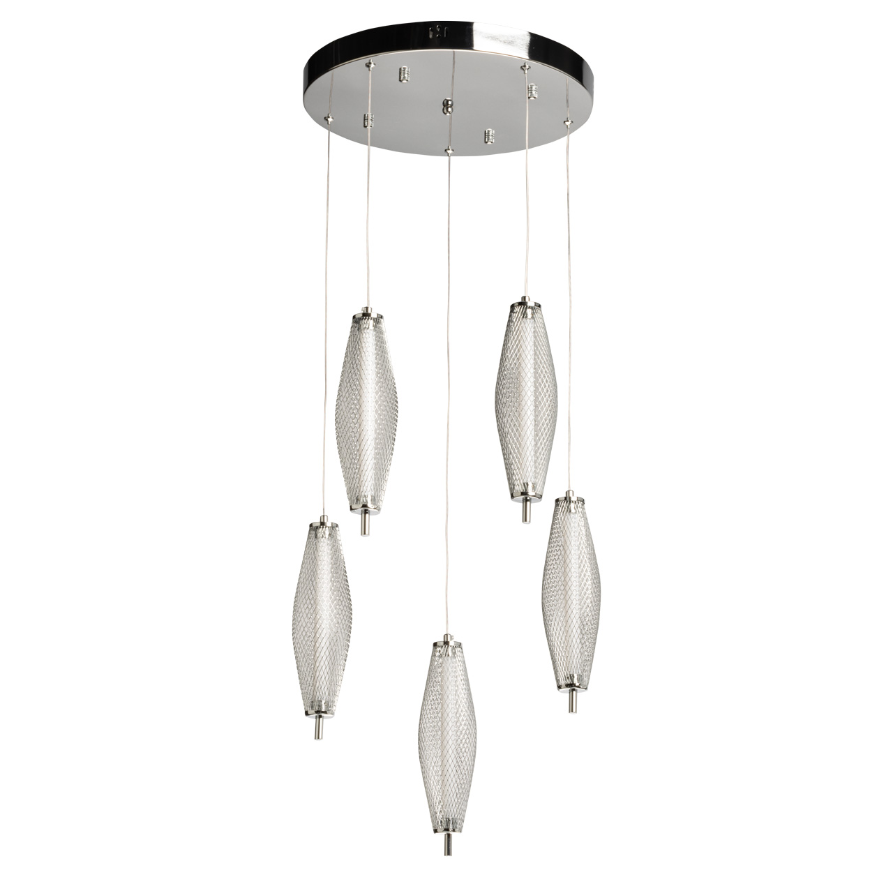 Каскадная люстра Ракурс — это не просто осветительный прибор, а настоящий элемент декора, который способен преобразить любое пространство. В её дизайне сочетаются современные технологии и эстетика, что делает её идеальным выбором для различных интерьеров.Основание люстры выполнено из прочного металла, который подвергся гальванизации в элегантный цвет хром. Этот выбор материала не случаен: хромированный металл не только выглядит современно, но и обеспечивает долговечность изделия. Благодаря своему блестящему покрытию, хром легко вписывается в любые стили интерьера — от индустриального лофта до строгого минимализма, добавляя нотку современности.Одной из ключевых особенностей люстры Ракурс являются её плафоны, выполненные из металлической сетки. Этот элемент дизайна не только привлекает внимание, но и соответствует актуальным трендам в современном освещении. Сетка позволяет свету мягко рассеивается, создавая уютную и комфортную атмосферу в помещении. Внутри металлической сетки расположены белые акриловые трубки, в которых находятся встроенные светодиоды. Это решение обеспечивает равномерное освещение, что делает светильник не только стильным, но и практичным. #### Идеальные размеры и мощностьКаскадная люстра Ракурс имеет общую высоту 110 см, что делает её универсальным решением для различных типов помещений. Она прекрасно смотрится как в высоких залах, так и в более низких пространствах, благодаря возможности регулировки высоты. Мощность светильника составляет 30 W, что позволяет эффективно освещать площади размером до 11 квадратных метров. Это делает люстру идеальной для использования в гостиных, столовых и кухнях в качестве общего или локального освещения.Цветовая температура светильника составляет 4000 K, что соответствует нейтральному белому свету. Такой свет не утомляет глаза и создает комфортные условия для работы и отдыха. Он идеально подходит для выполнения различных задач, от чтения и работы за компьютером до создания уютной атмосферы для общения с близкими.