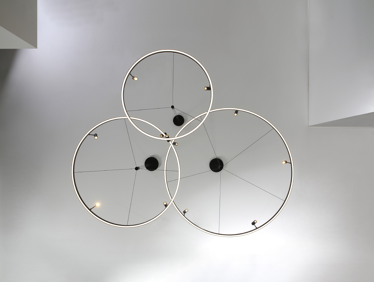 Подвесной светильник Delight Collection P0506-900A black в виде большого кольца из металла черного цвета. На кольце расположены три спота. Светильник имеет несколько источников света: 3 спота по 4W и светодиодную ленту общей мощностью 40W (свет направлен вниз).