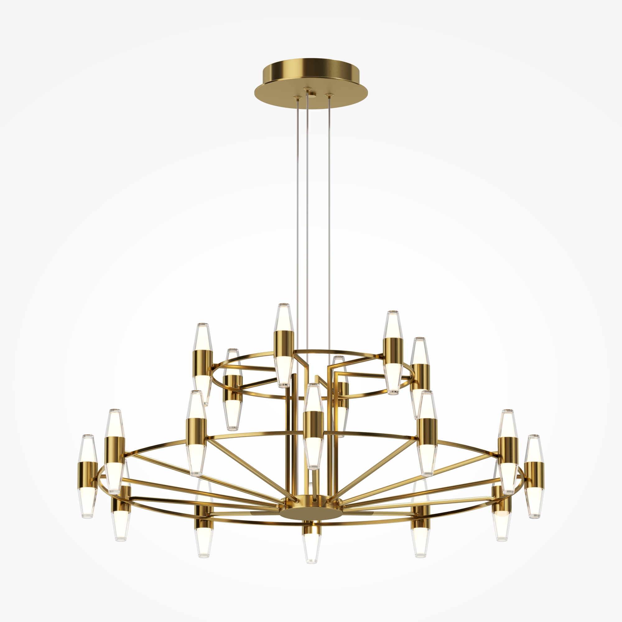 Цвет арматуры — латунь. Двойной плафон, выполненный из двух типов высококачественного акрила - матовый и прозрачный. Объемное освещение с равномерным распределением света во всех направлениях. LED-источник света. Комфортный для глаз свет при значительном световом потоке. Регулируемая высота подвесных моделей.