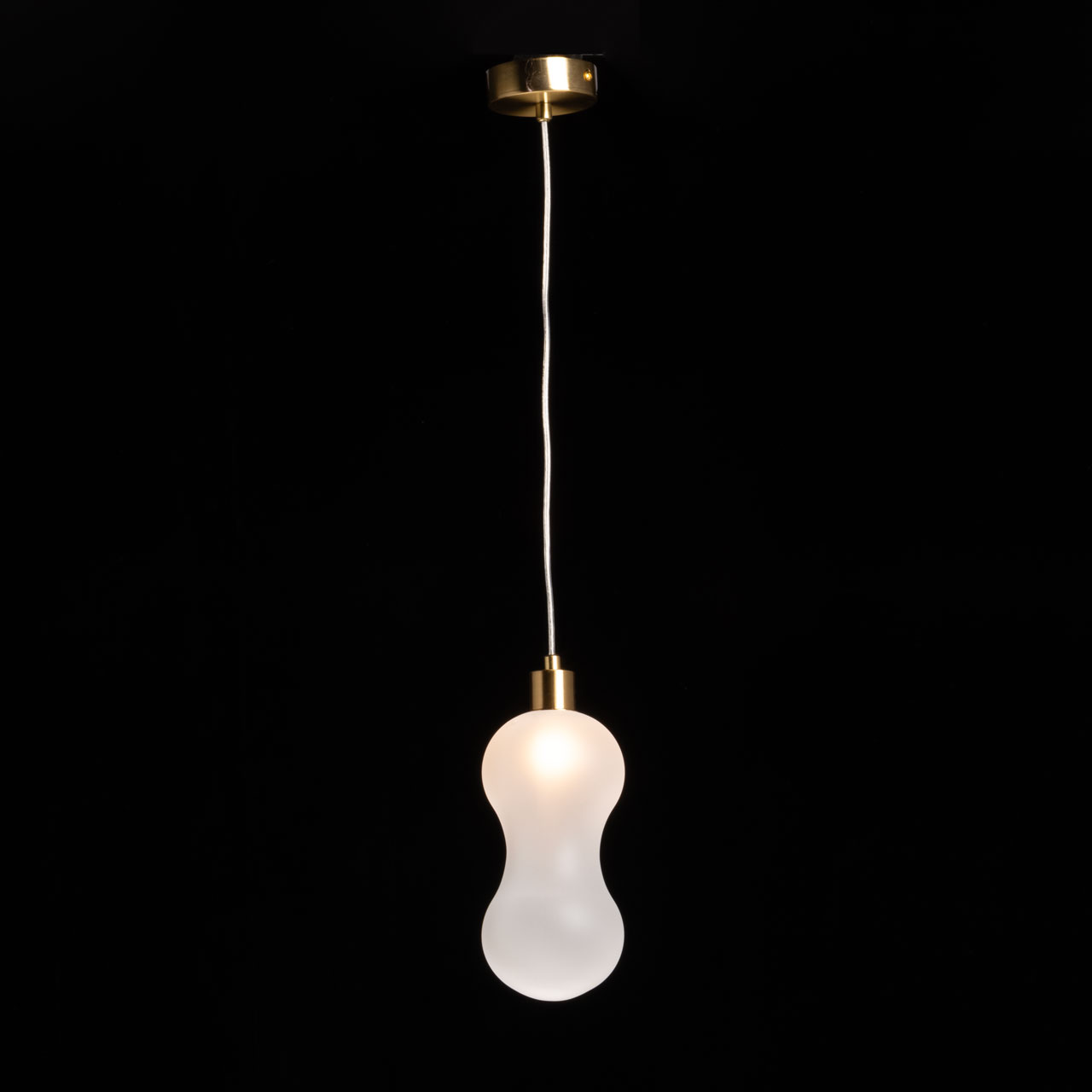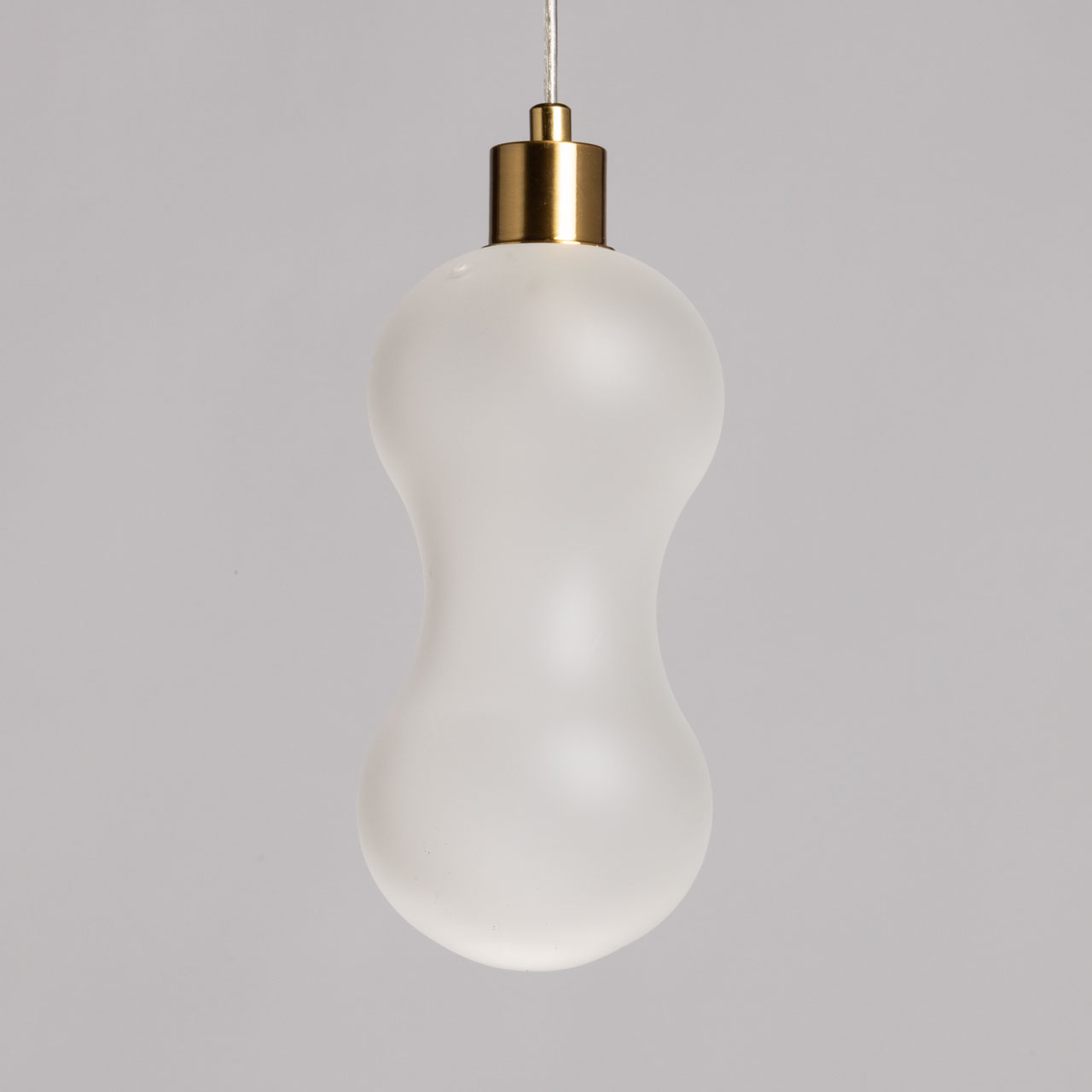 Металлическое основание подвесной люстры гальванизировано в цвет латуни. Стеклянный плафон выдувается в сложную форму и матирован изнутри.