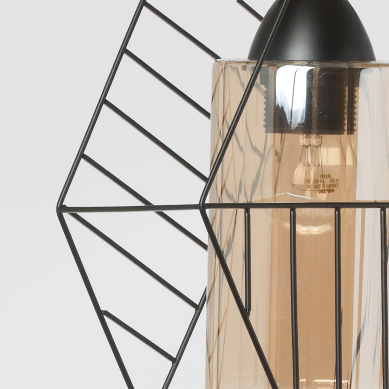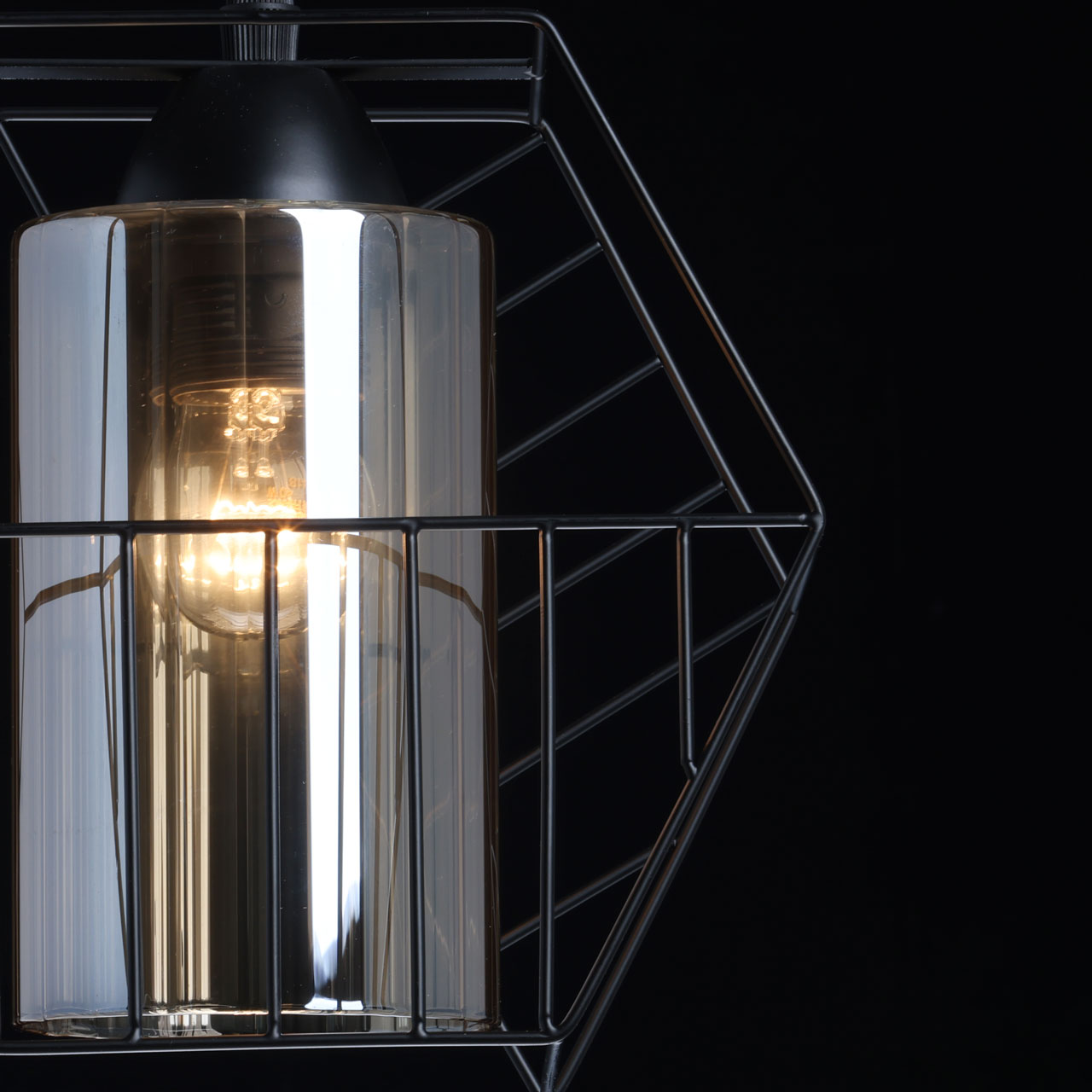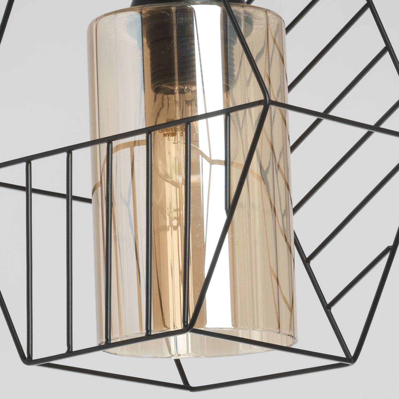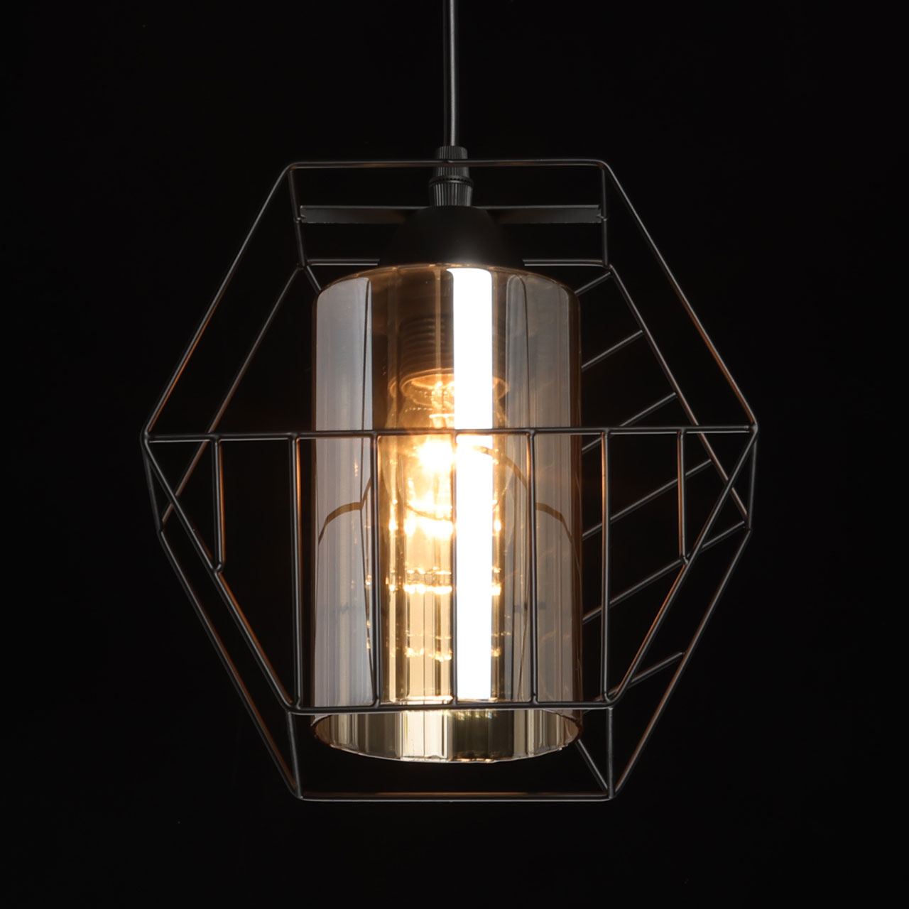 Металлическое основание подвеса окрашено в черный цвет. Источник света закрыт двойным плафоном. Внешний плафон геометричной формы выполнен из металла и окрашен в цвет основания. Внутренний плафон отлит из стекла, гальванизированного в цвет шампань.