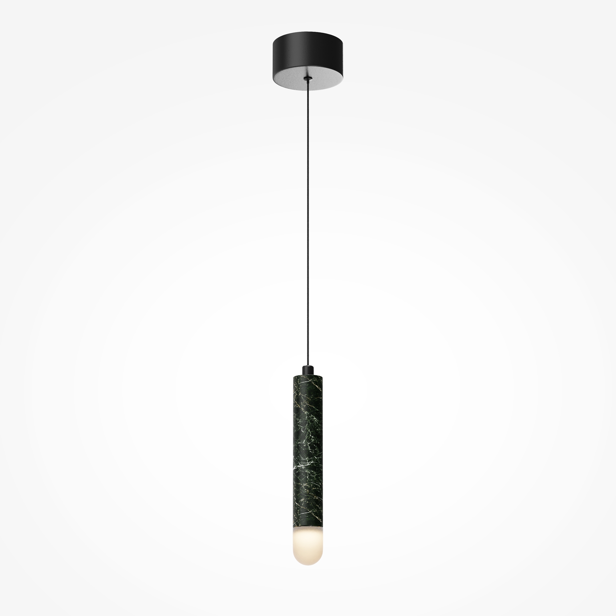 Главный акцент серии — натуральный зелёный мрамор с его неповторимым природным рисунком. Чёрная металлическая арматура создаёт гармоничный контраст. LED-источник с температурой 3000К, скрытый за акриловым рассеивателем, создаёт атмосферную подсветку для деликатного зонирования. В серии представлены подвесы двух форм — конус и вытянутый цилиндр, которые можно использовать как сольные акценты или комбинировать в многоуровневые композиции, меняя длину провода (3000 мм).