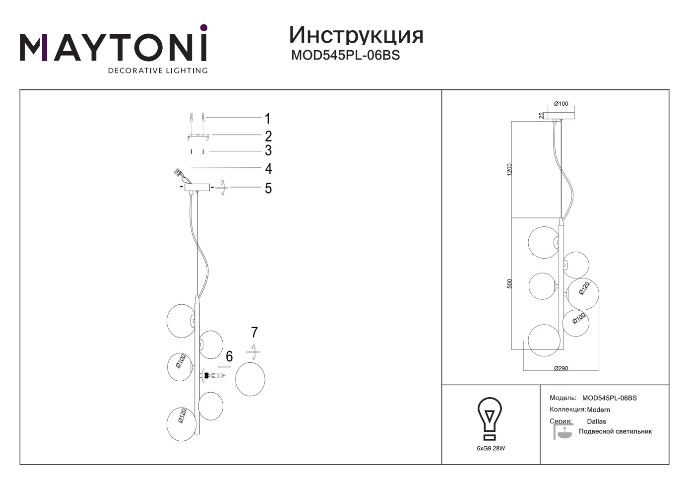 Осветительный прибор Dallas MOD545PL-06BS оснащен 6 источниками света с типом цоколя G9 и мощностью 28 Вт каждая, при этом общая мощность устройства составляет 168 Вт, что позволяет создать комфортное освещение в любом интерьерном пространстве.