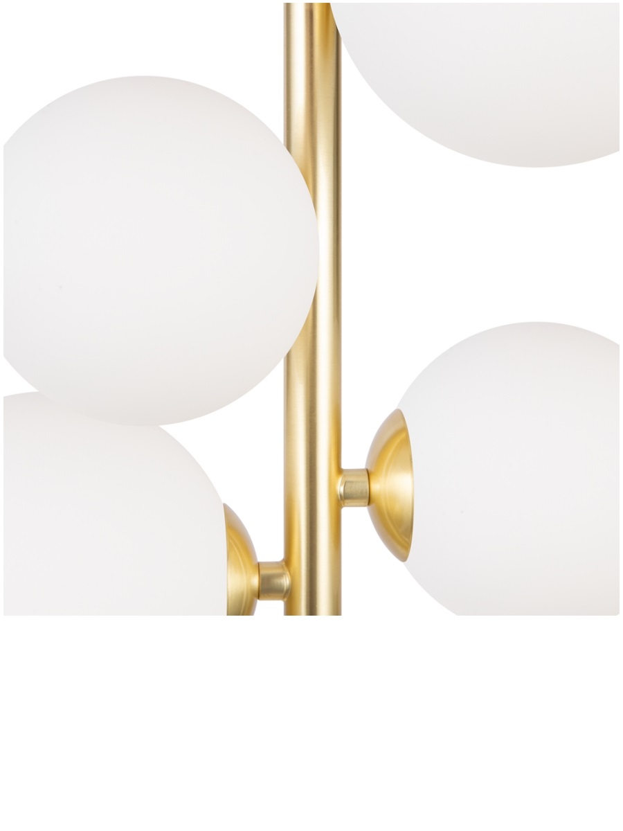 Подвесной светильник выполнен из высококачественных материалов: металлического каркаса в золотом цвете и белых стеклянных плафонов, изготовленных в форме шаров разного диаметра и висящих на вертикально подвешенной штанге. Благодаря своей компактности и размерам 290 мм х 1700 мм, а также регулировке по высоте от 525 мм до 1725 мм, она идеально впишется в любой интерьер и добавит изысканности вашему пространству. Тип подвеса трос.