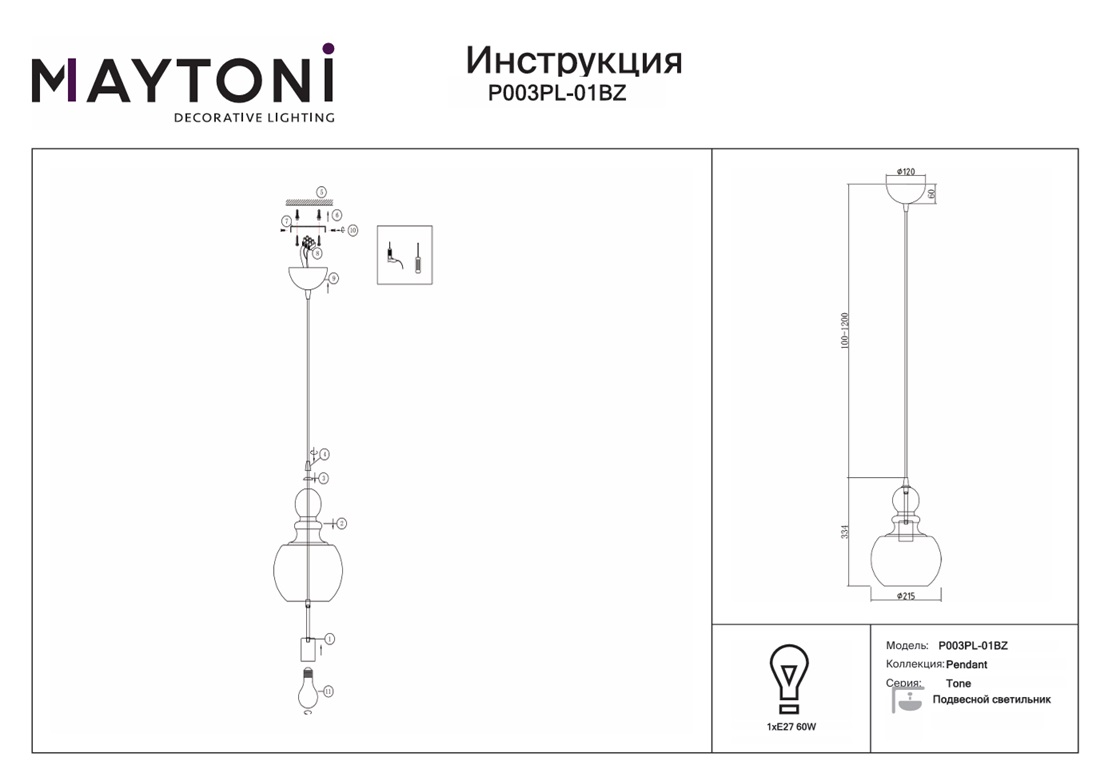 Подвесной светильник Maytoni Tone P003PL-01BZ в Оренбурге