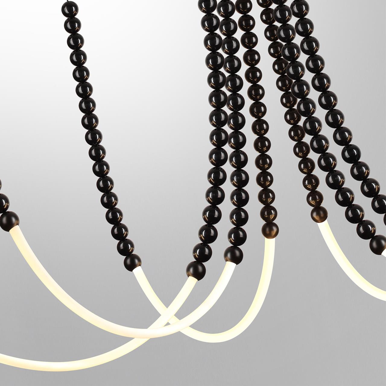 Monella — оригинальная форма большой серии светильников в легком игривом дизайне с использованием черных полированных шариков из акрила. В светильнике используются необычные фиксаторы к потолку в виде россыпи маленьких металлических шариков, которые можно расположить на любом удалении от центра светильника и, таким образом, создать свою форму.
