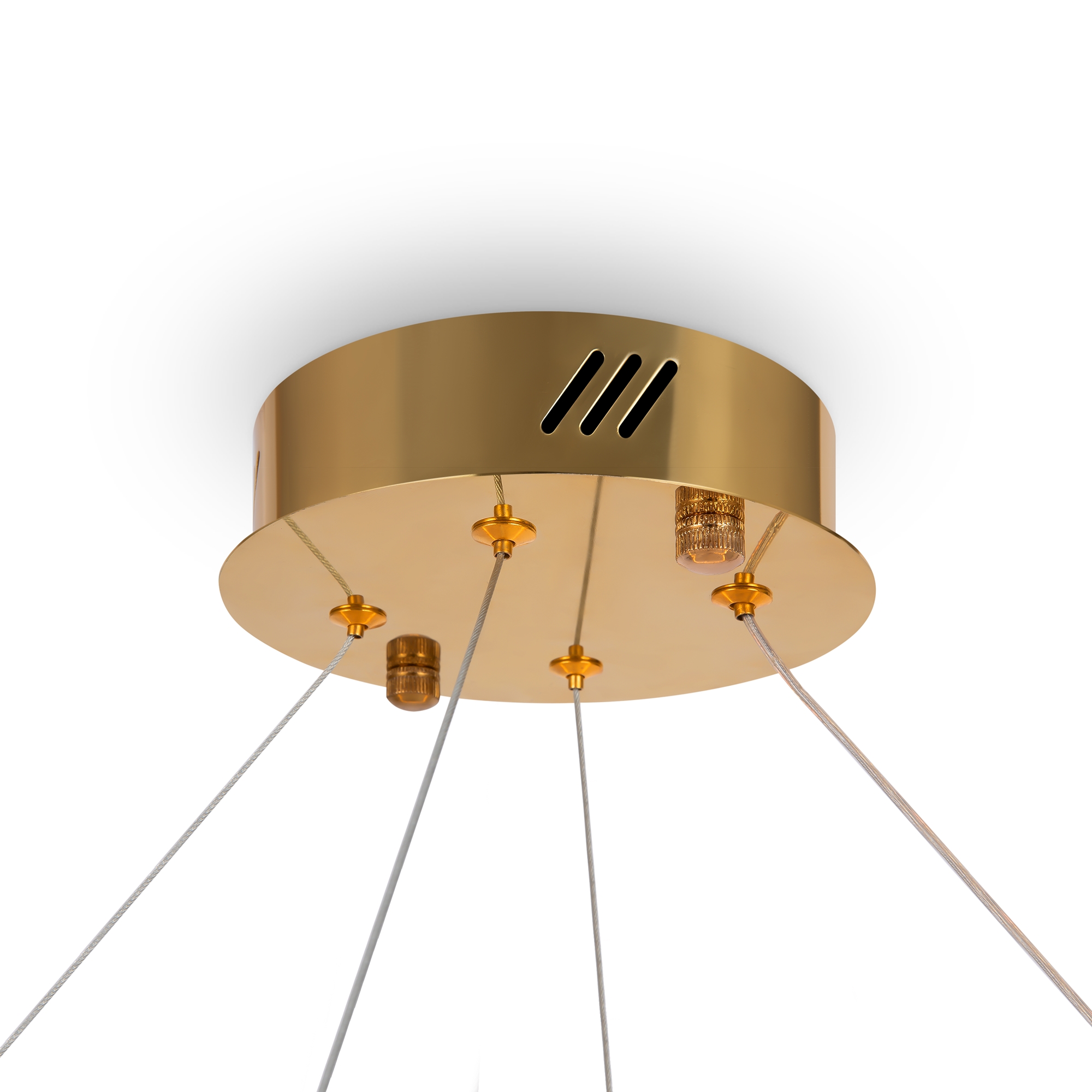 Металлическая арматура в цвете латунь и хром. Хрустальные декоративные кольца с геометричными гранями. LED-источник света. Регулировка цветовой температуры (3000-4000-5000K) и яркости 4G-dimming при помощи пульта (в комплекте).