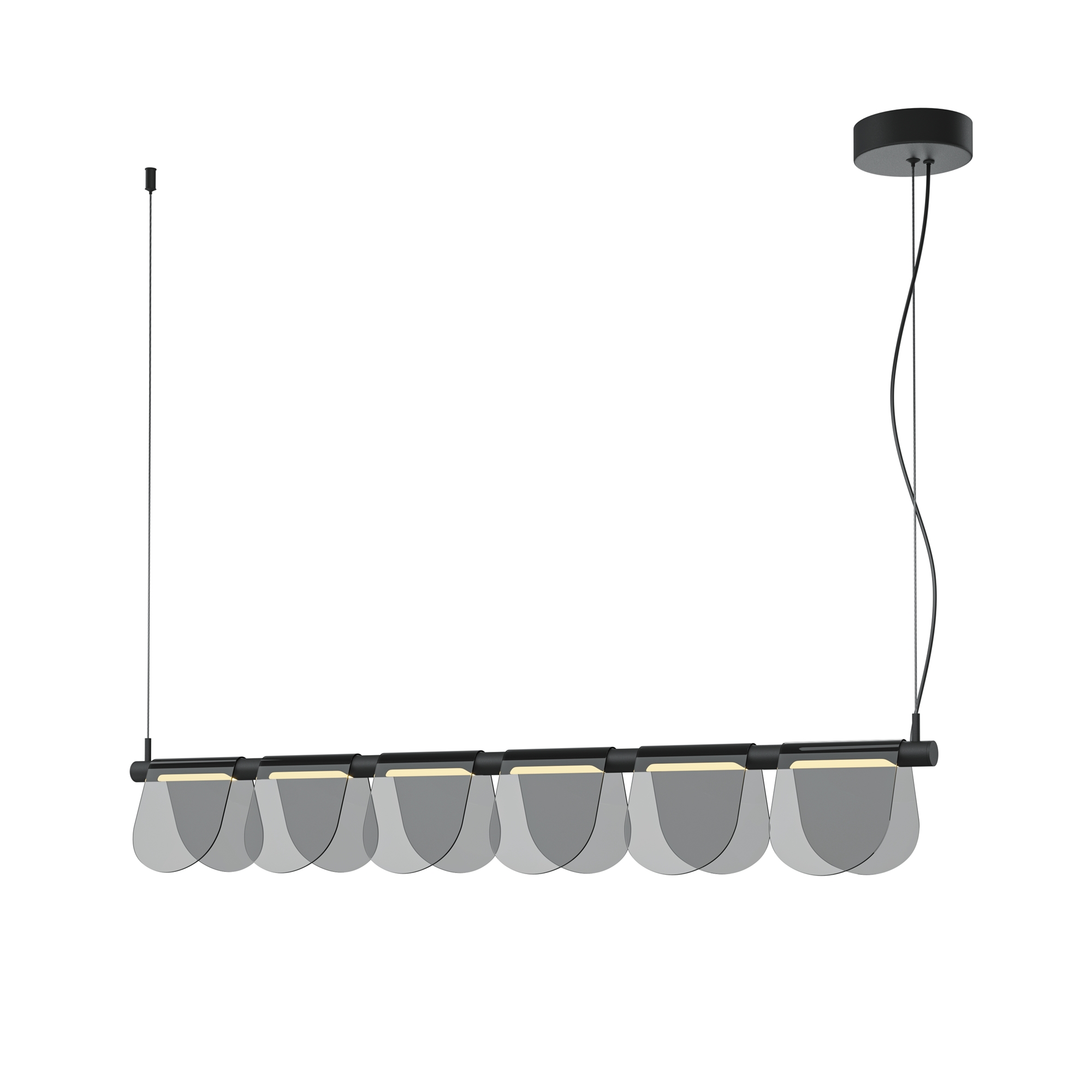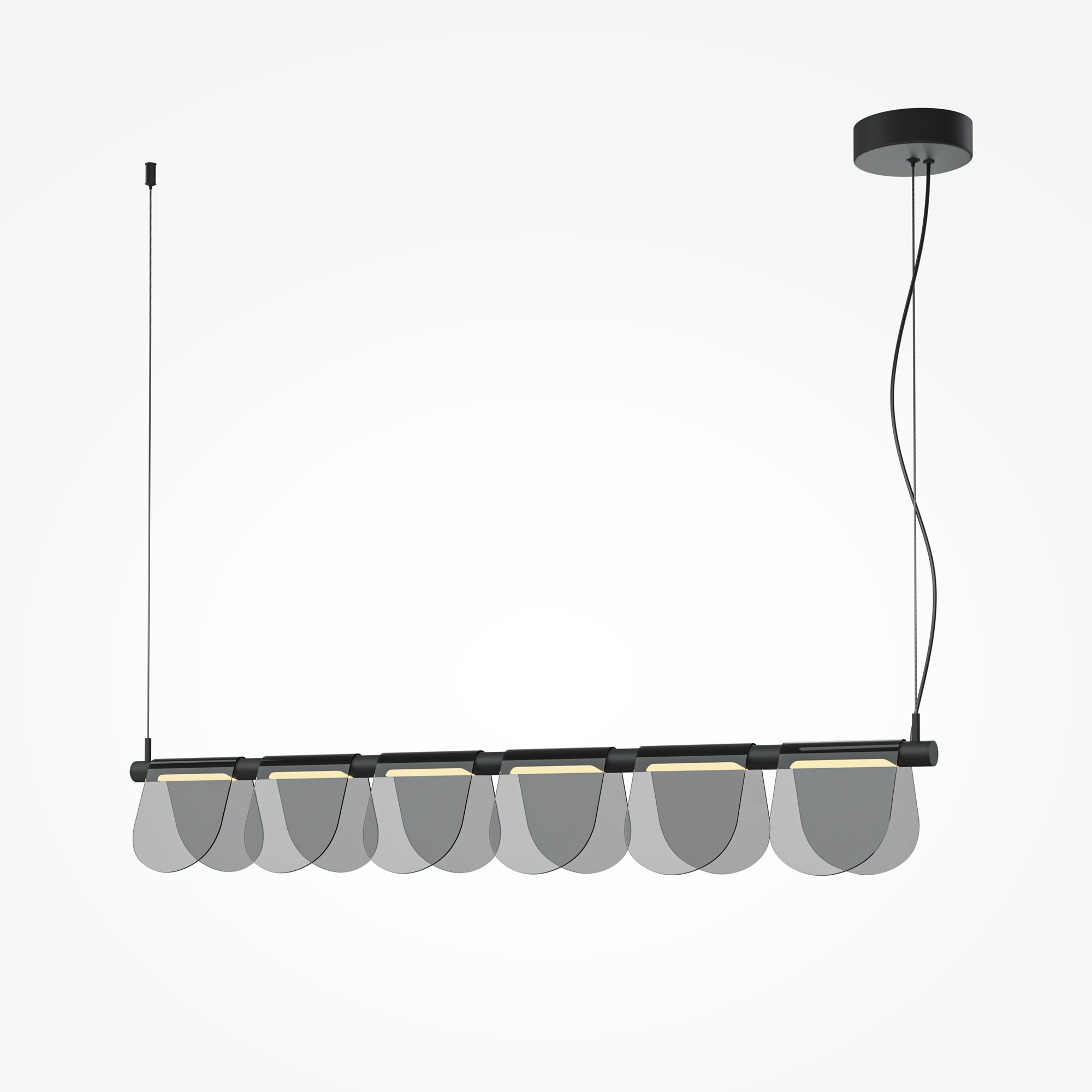 Металлическая арматура черного цвета с антибликовым эффектом sandy. Акцентные плафоны-пластины выполнены из высококачественного тонированного стекла. Благодаря специальной технологии придания цвета стеклу в момент его производства, достигается высокий уровень прозрачности и равномерного окрашивания по всей поверхности плафона. LED-источник света, с температурой цвета 3000К, угол рассеивания 120 градусов, высокий световой поток. Регулируемая длина провода 3 метра – подходит для установки в помещениях с высокими потолками.