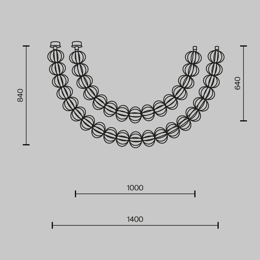 Арматура - металл, цвет - золото. Декоративные проволочные плафоны-сферы - ручная работа. Горизонтальные подвесы в двух вариантах монтажа - накладном и скрытом. Световой элемент - силиконовая трубка с LED-источником. Цветовая температура 3000К.