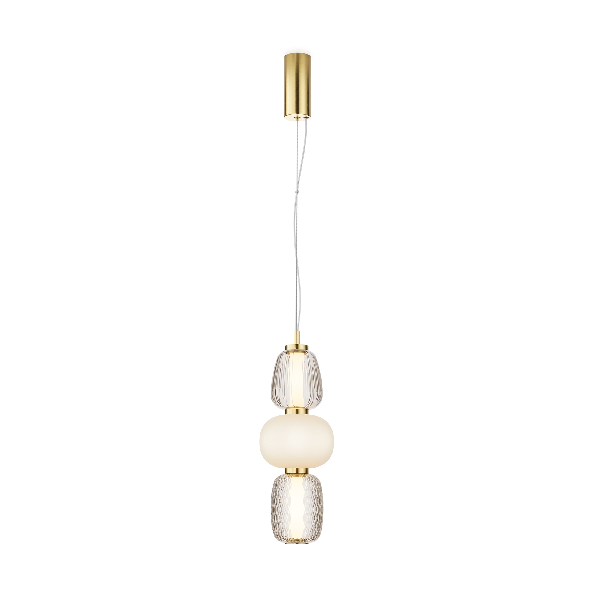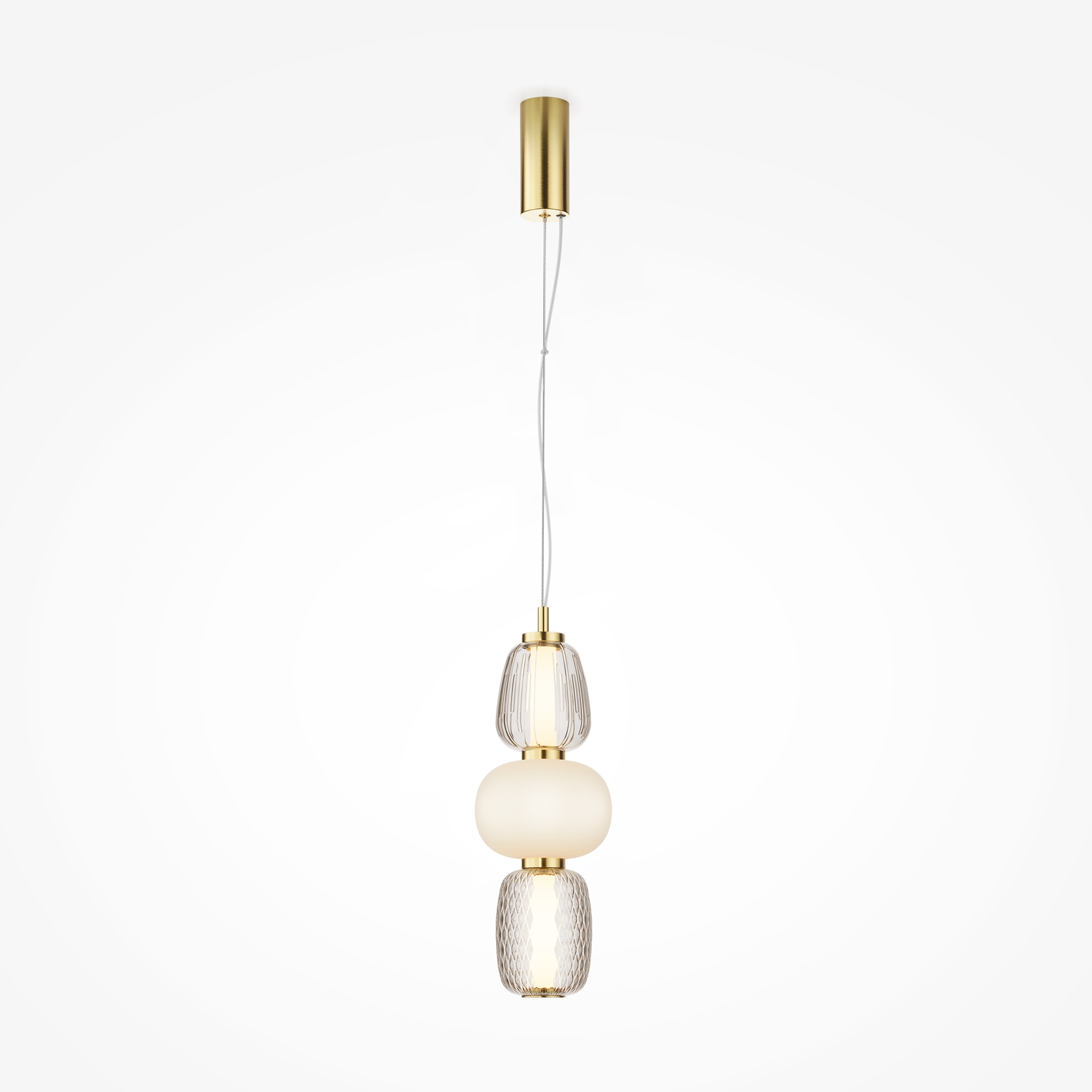 Металлическая арматура, цвет - золото, хром. Микс плафонов округлых и вытянутых форм из белого матового и прозрачного стекла с сетчатым и с линейным повторяющимся рельефным рисунком. Регулируемая высота подвесных моделей, провод - 3 метра. LED-источник света, цветовая температура 3000К.
