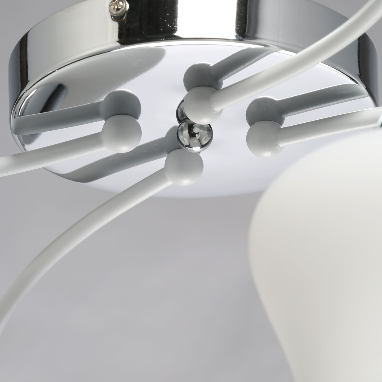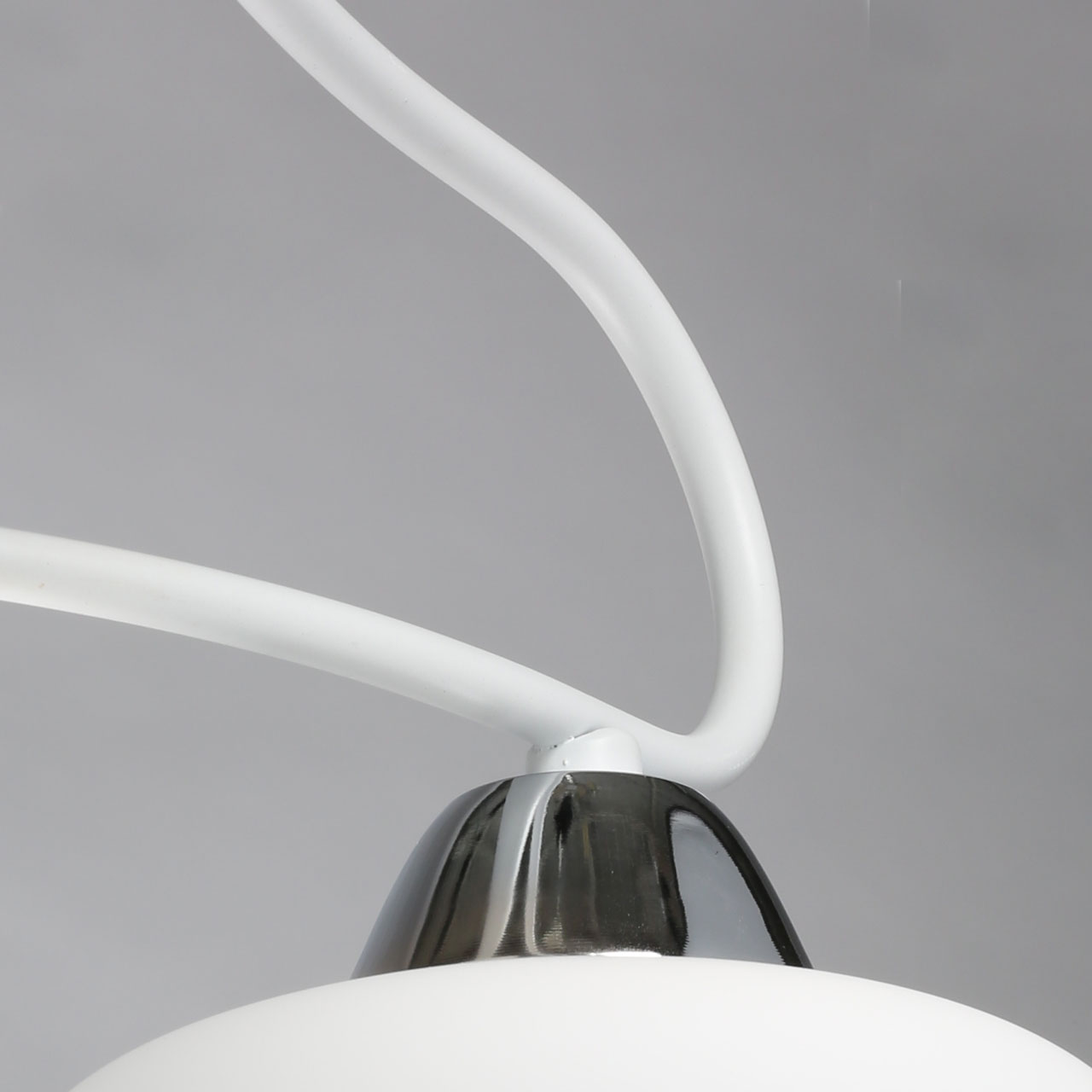 Основание светильника выполнено из металла. Потолочная чаша и держатели плафонов гальванизированы в цвет хрома, рожки окрашены в белый цвет. Стеклянные плафоны выдуваются вручную в форму и окрашены в белый цвет.