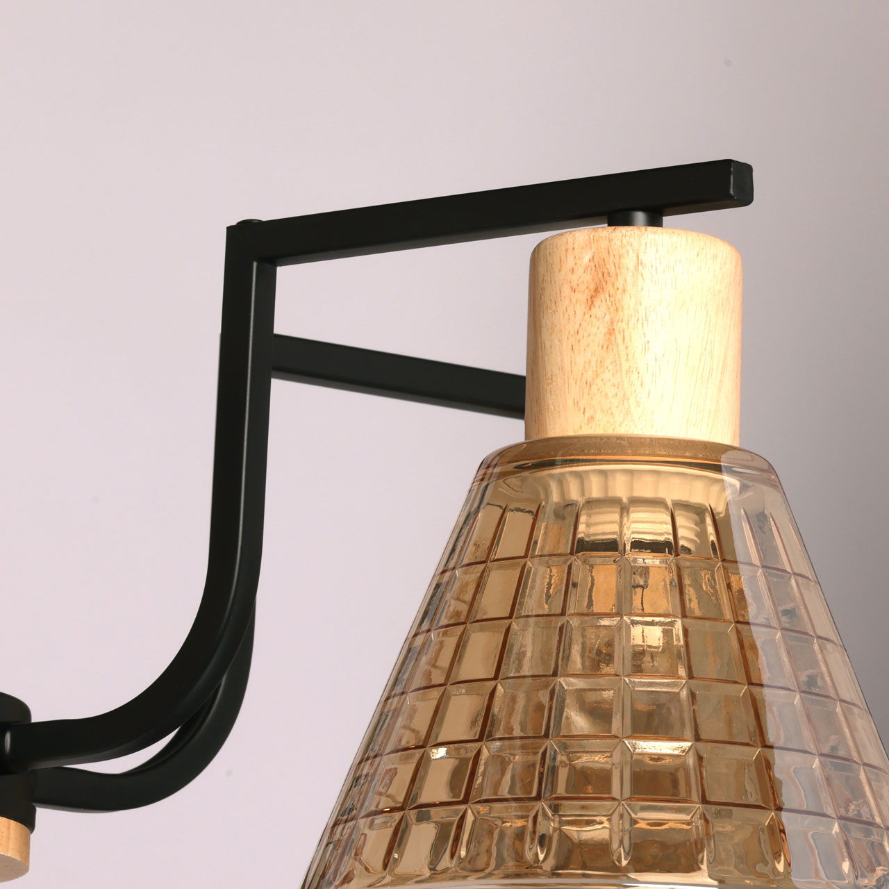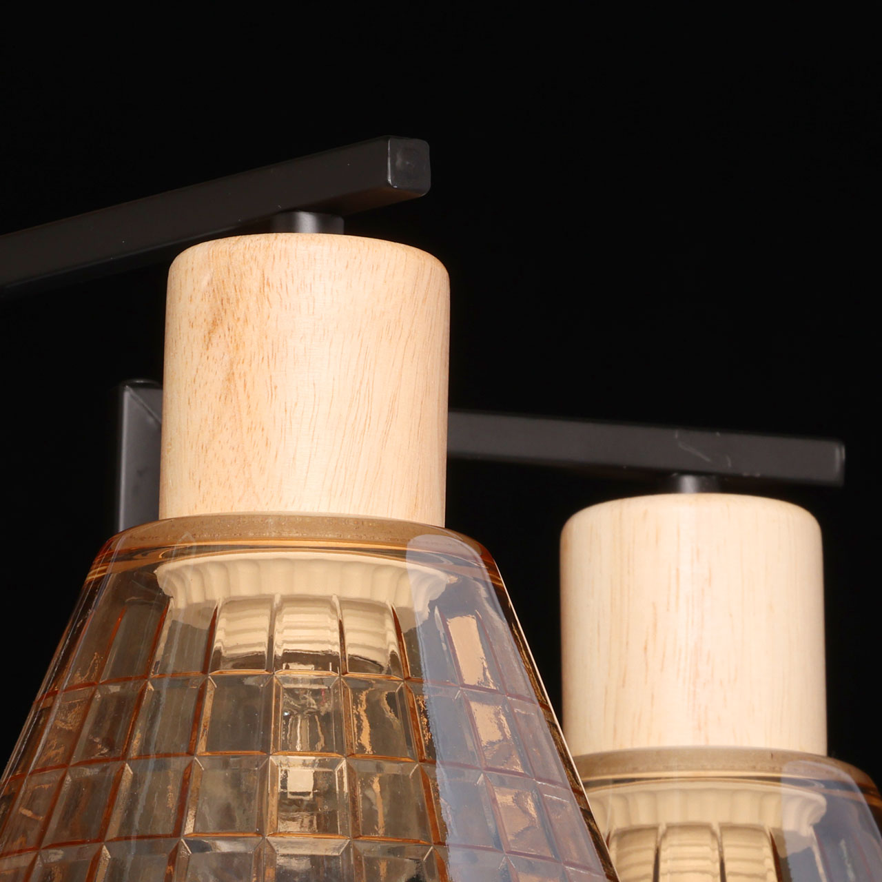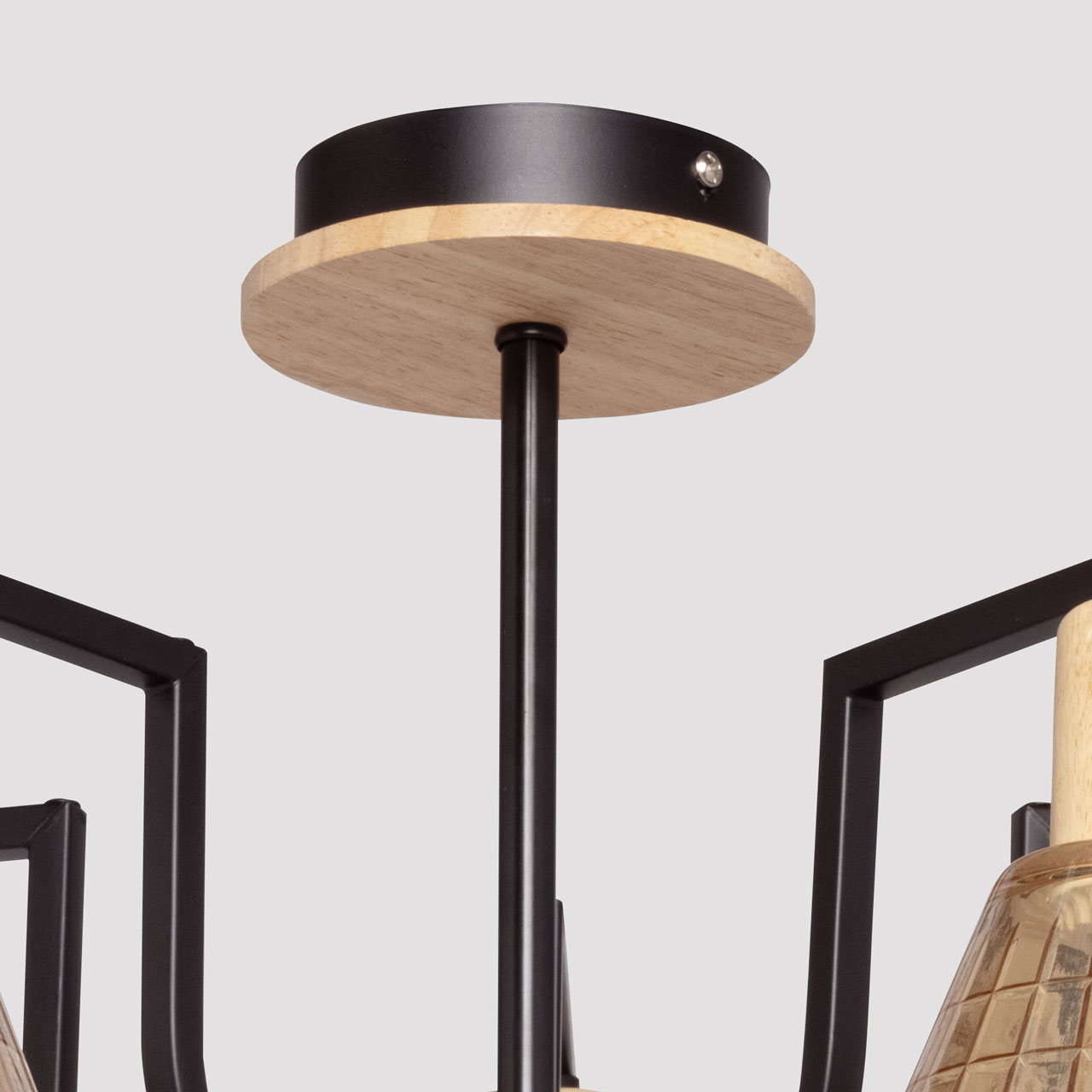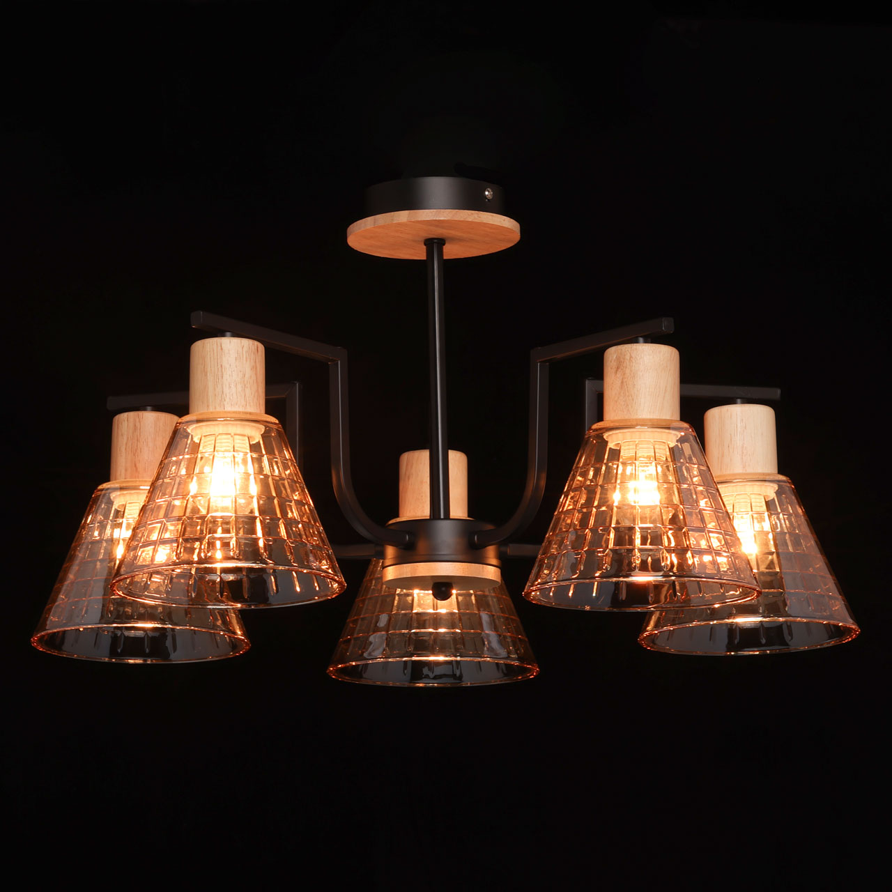 Металлическое основание потолочной люстры окрашено в черный цвет. Стеклянные плафоны отлиты в сложную форму и гальванизированы в цвет шампань. Светильник декорирован элементами из натурального светлого дерева.