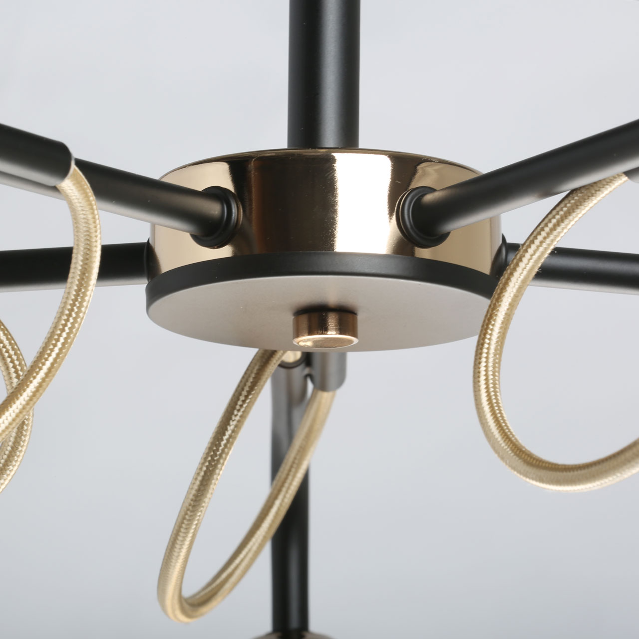 Металлическое основание потолочного светильника окрашено в черный цвет. Отдельные элементы гальванизированы в цвет золота. Стеклянные плафоны выдуваются в сложную форму и гальванизированы в цвет шампань