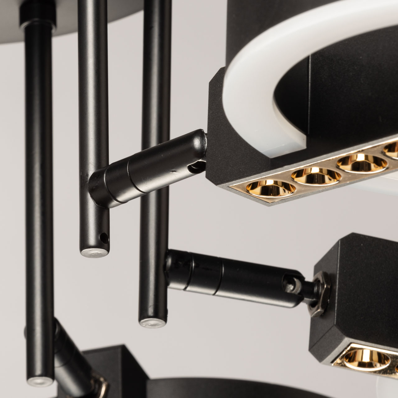 Металлическое основание подвесной люстры окрашено в черный цвет. Корпус плафонов выполнен из сплава алюминия и окрашен в цвет основания. Светодиодные источники декоративного света закрыты матовым акрилом. Открытые функциональные точечные светодиоды углублены в корпус плафонов.