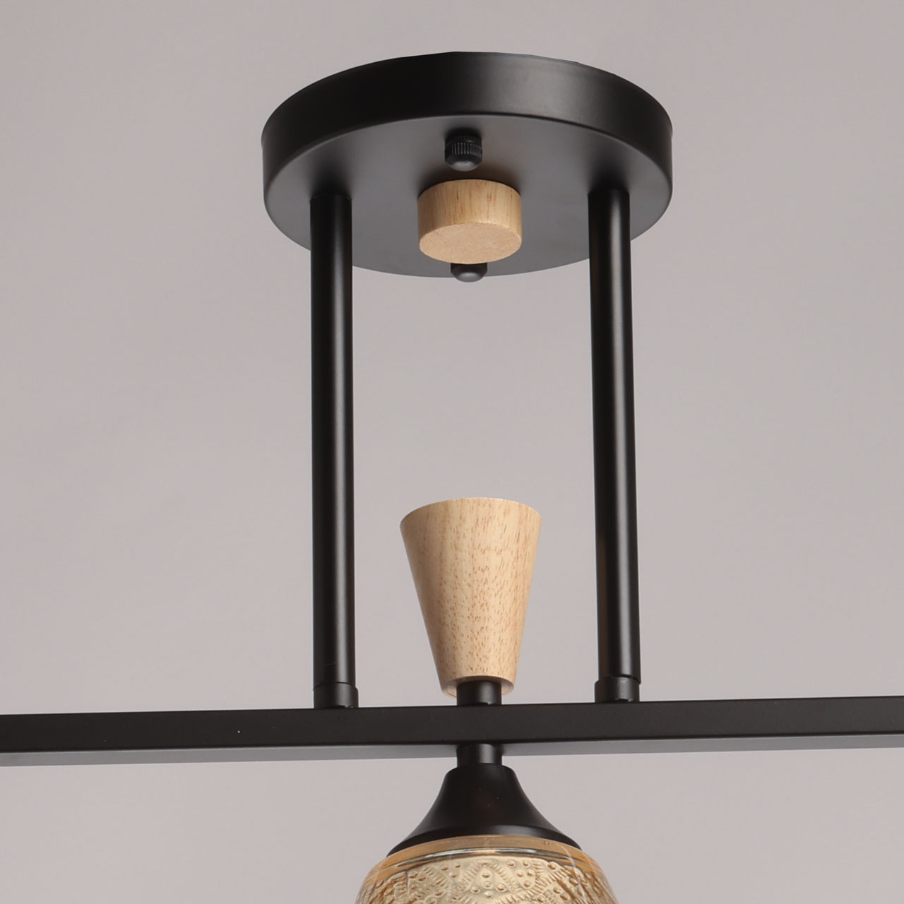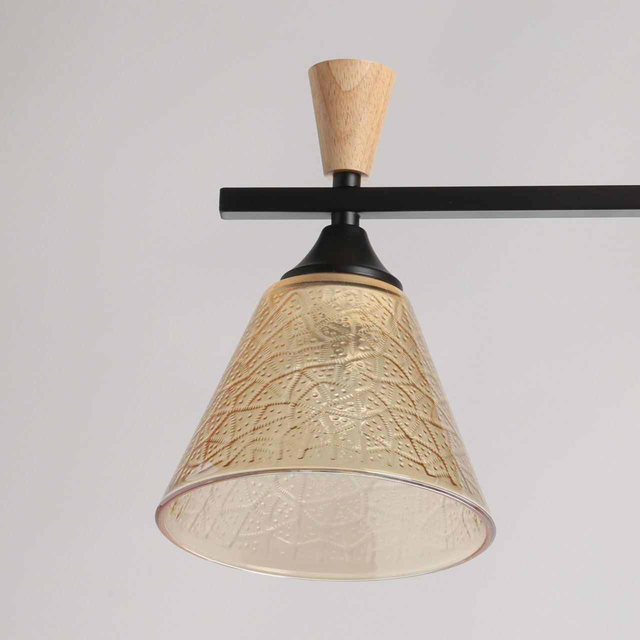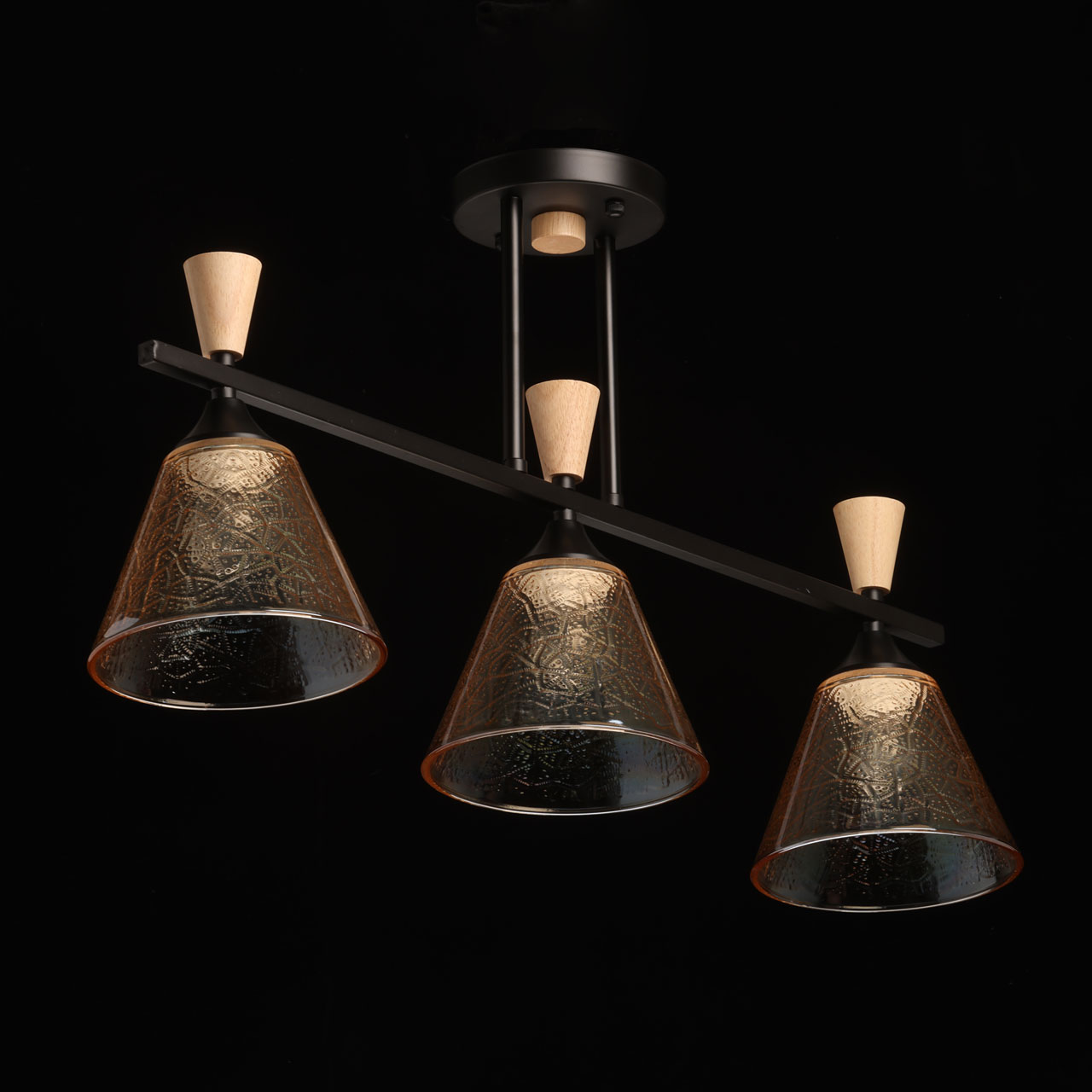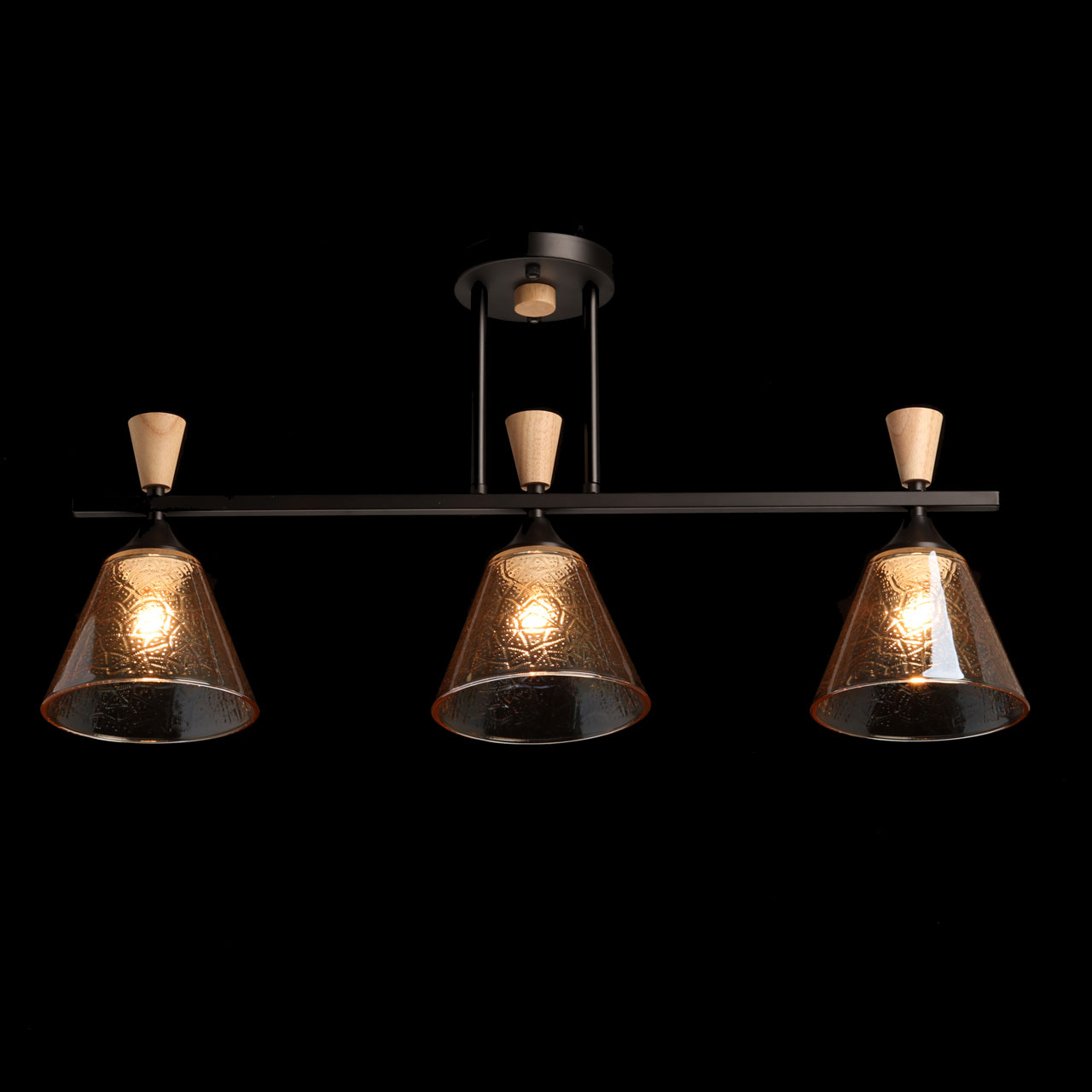 Металлическое основание потолочной люстры окрашено в черный цвет. Стеклянные плафоны отлиты в фактурную форму и гальванизированы в цвет коньяка. Потолочная люстра декорирована элементами из светлого натурального дерева.