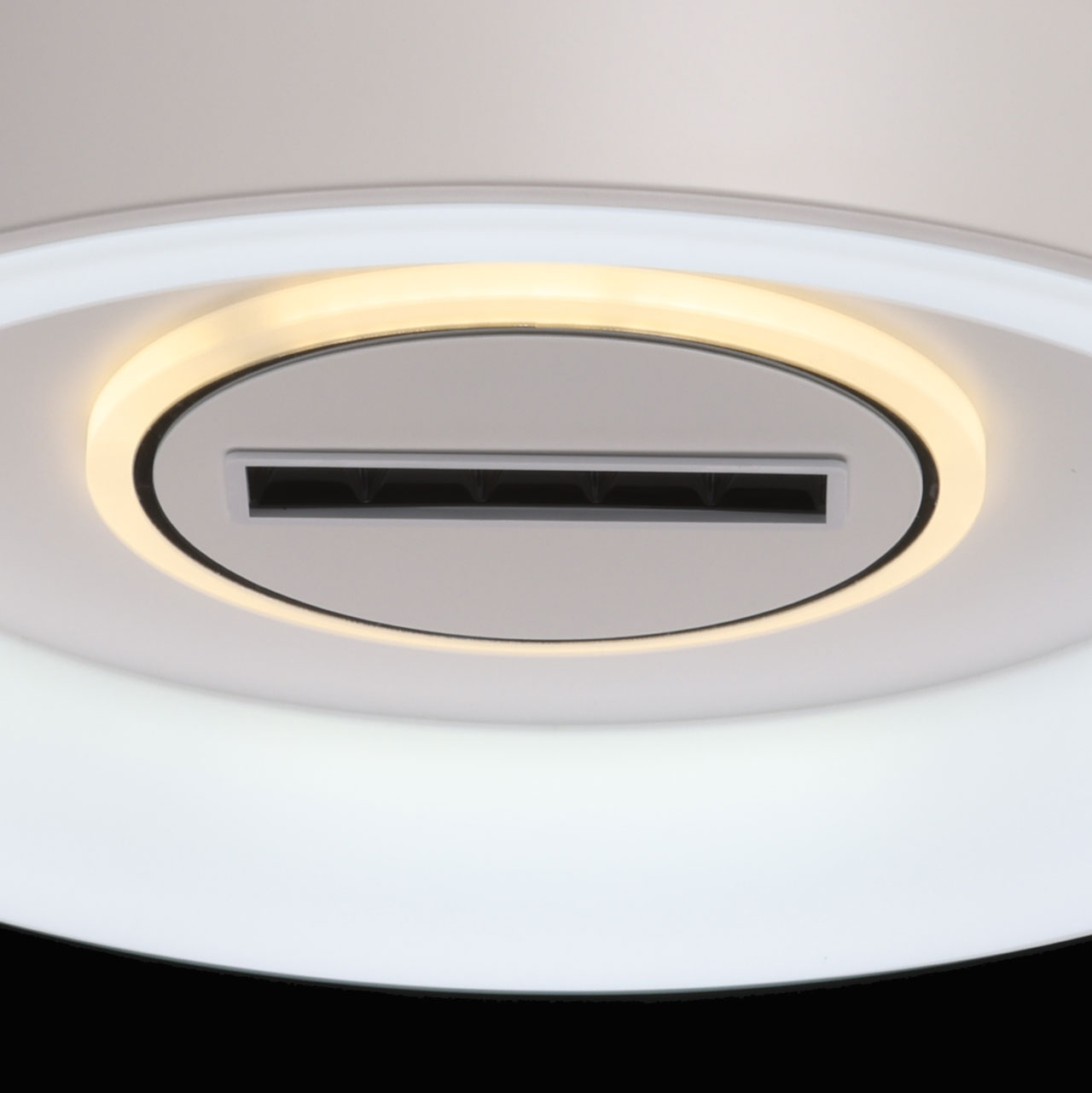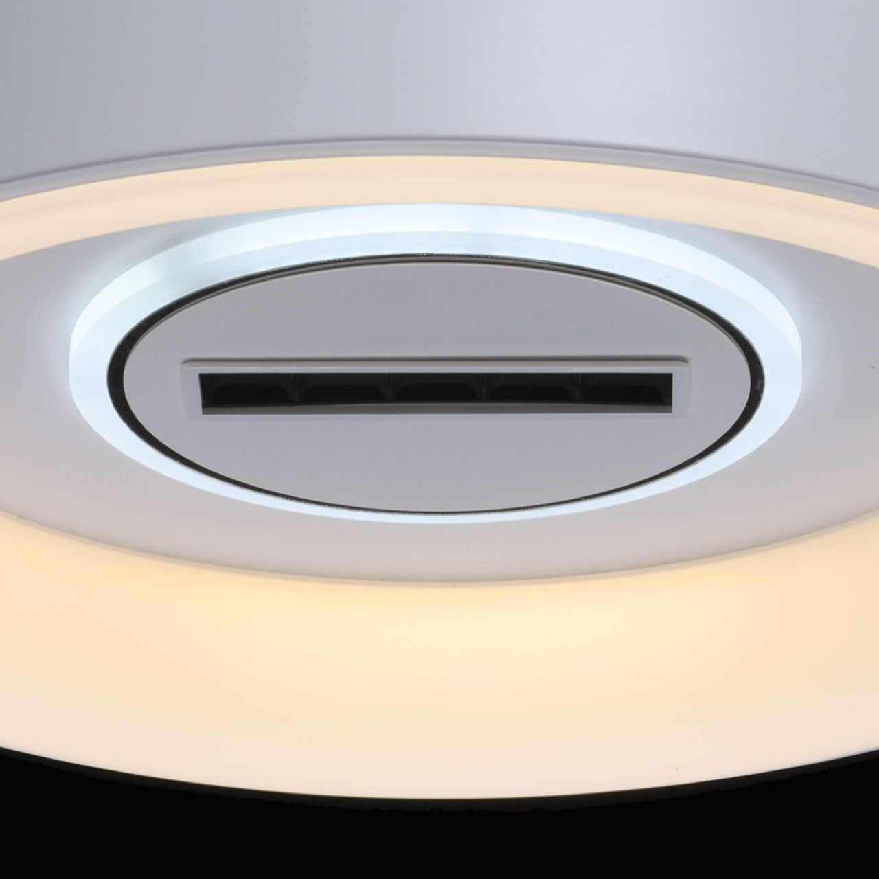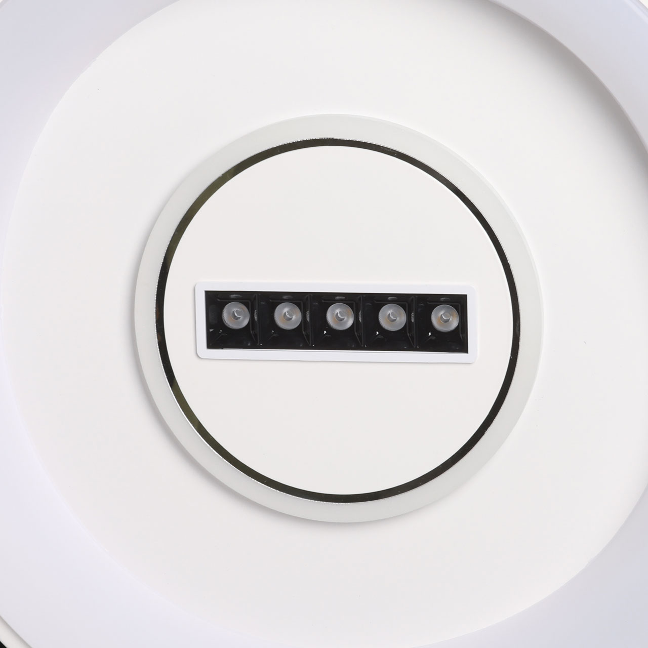 Металлическое основание светильника окрашено в белый цвет. Светодиодные источники света закрыты белым матовым акрилом. В центр светильника, выделенного металлическим кантом, гальванизированным в цвет хрома, на пластине из сплава алюминия, окрашенной в металлический цвет, встроены 5 светодиодов функционального освещения. В комплект входит пульт.