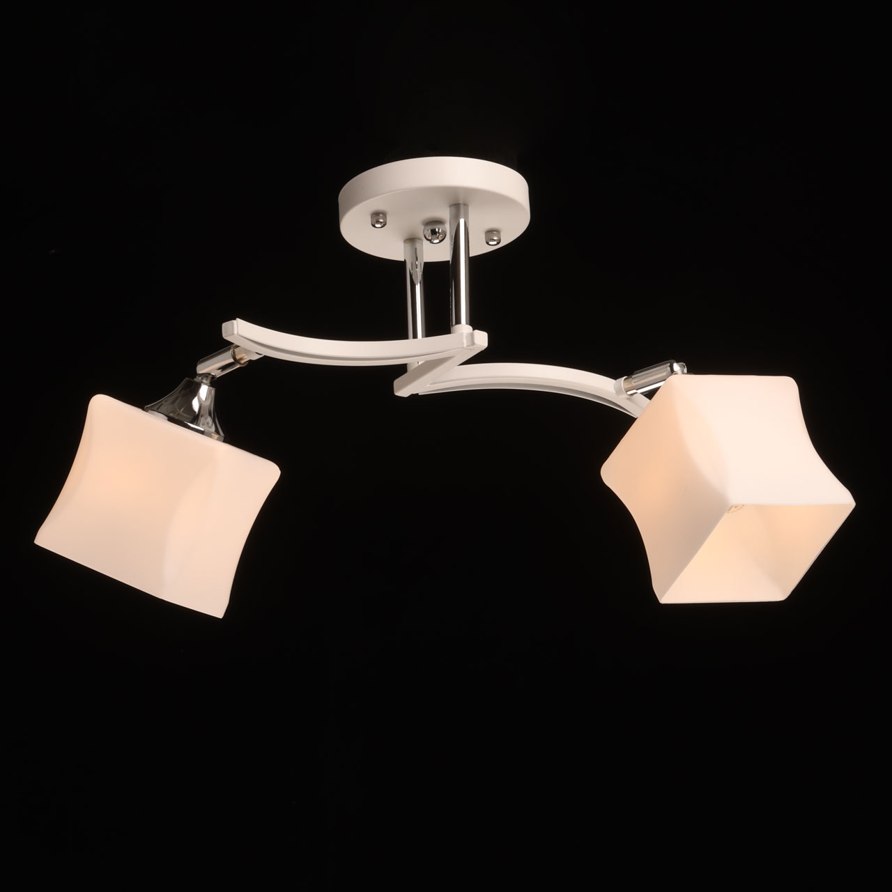 Металлическое основание потолочной люстры окрашено в белый цвет. Отдельные элементы основания гальванизированы в цвет хрома. Стеклянные плафоны отлиты в оригинальную форму и окрашены в белый цвет с внутренней стороны.