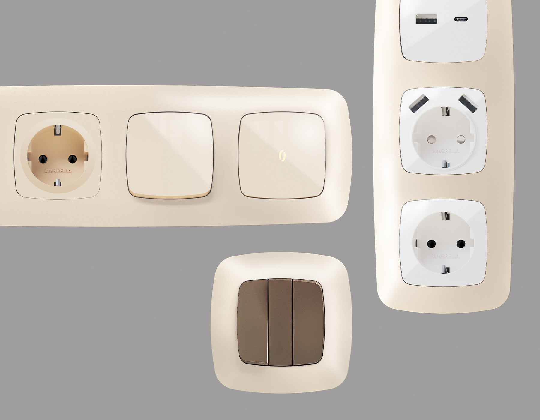 Многогранный ассортимент Ambrella Volt включает в себя механизмы, лицевые панели и рамки, а также комплекты, доступные в различных цветовых решениях. Продукция представлена в модульном исполнении, что позволяет гибко настраивать внешнийвид и функциональность. Вам будет легко заменить лицевую панель, рамку или механизм, найдя идеальное сочетание цветов.