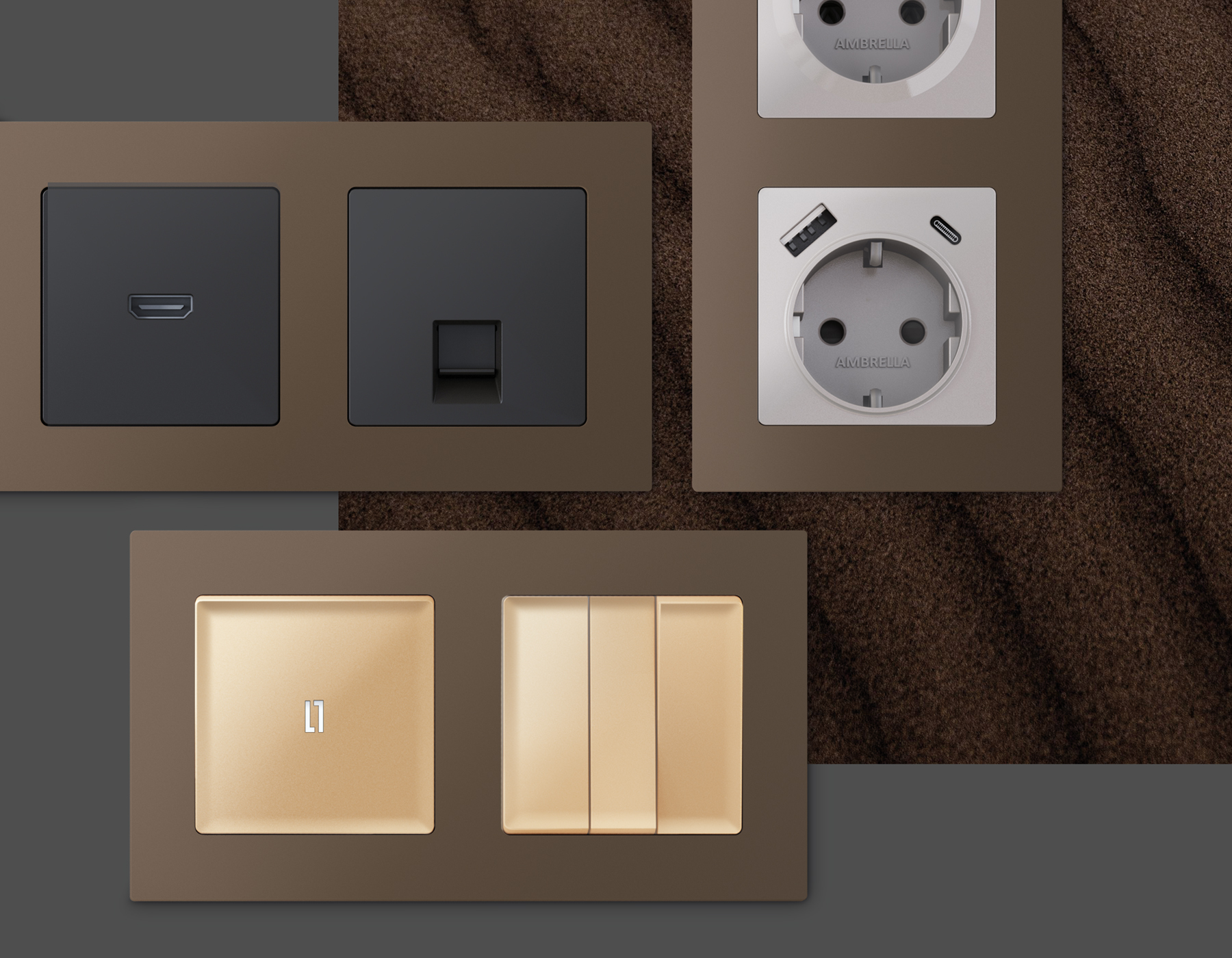 Многогранный ассортимент Ambrella Volt включает в себя механизмы, лицевые панели и рамки, а также комплекты, доступные в различных цветовых решениях. Продукция представлена в модульном исполнении, что позволяет гибко настраивать внешнийвид и функциональность. Вам будет легко заменить лицевую панель, рамку или механизм, найдя идеальное сочетание цветов.