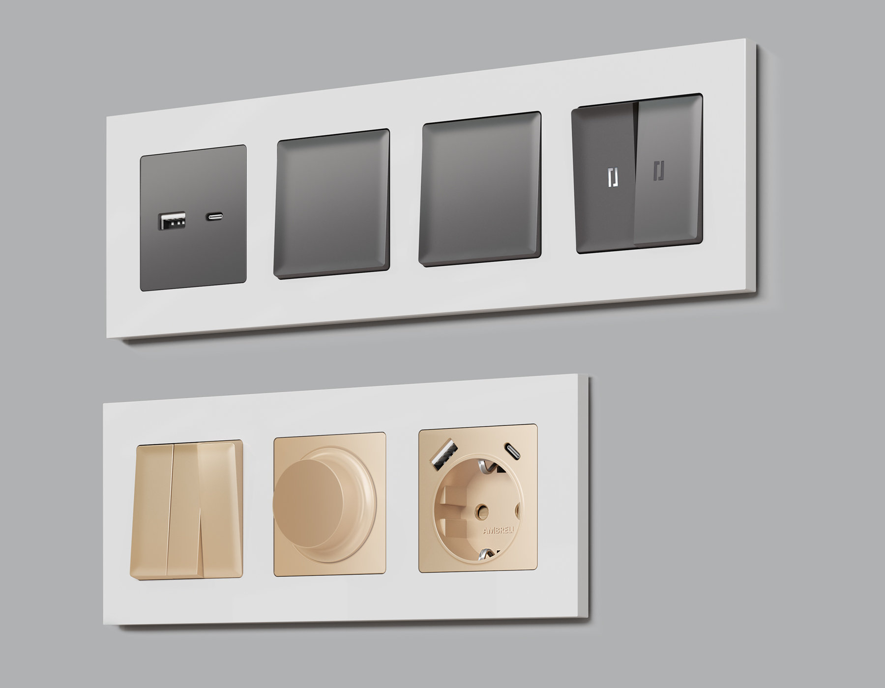 Многогранный ассортимент Ambrella Volt включает в себя механизмы, лицевые панели и рамки, а также комплекты, доступные в различных цветовых решениях. Продукция представлена в модульном исполнении, что позволяет гибко настраивать внешнийвид и функциональность. Вам будет легко заменить лицевую панель, рамку или механизм, найдя идеальное сочетание цветов.