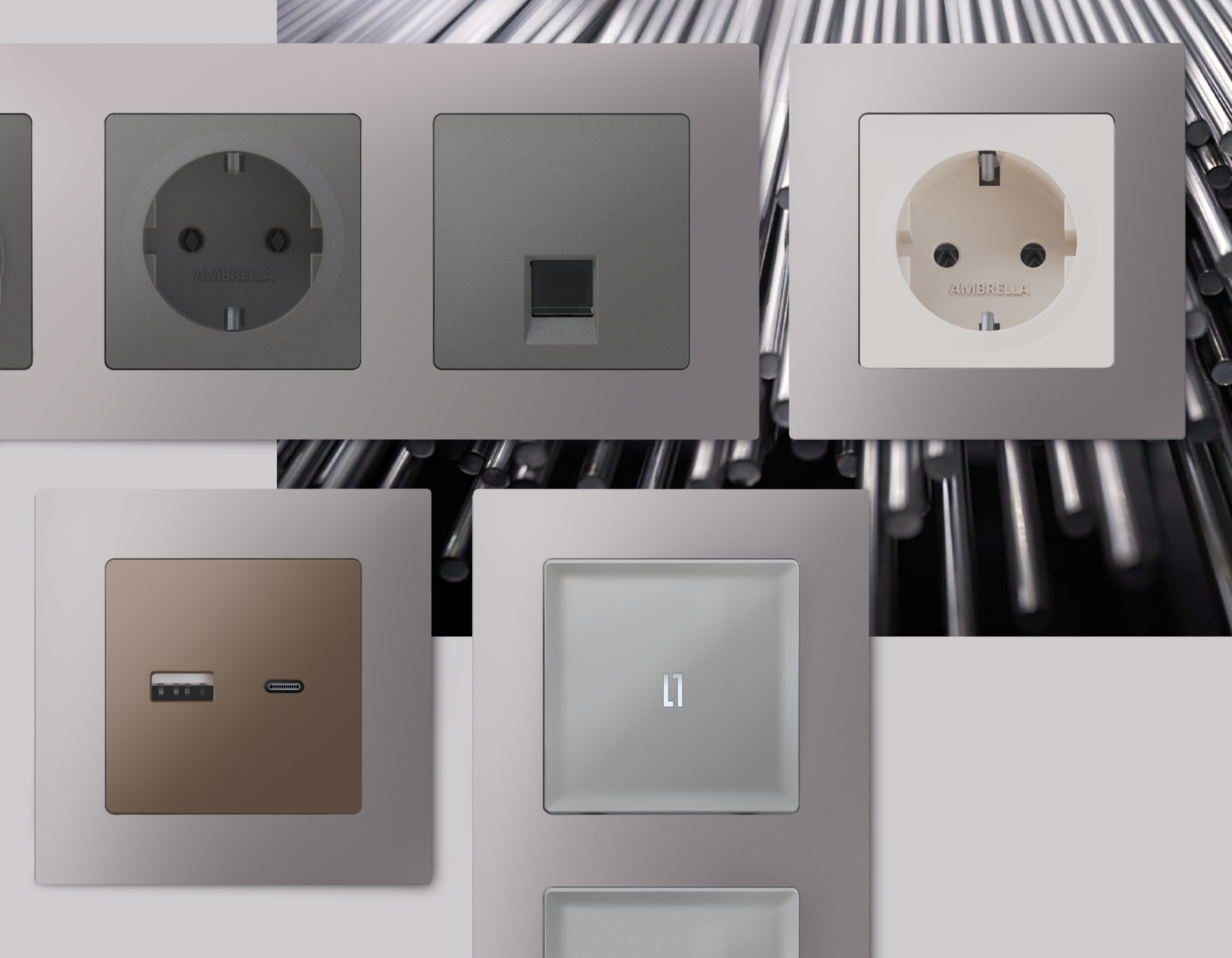 Многогранный ассортимент Ambrella Volt включает в себя механизмы, лицевые панели и рамки, а также комплекты, доступные в различных цветовых решениях. Продукция представлена в модульном исполнении, что позволяет гибко настраивать внешнийвид и функциональность. Вам будет легко заменить лицевую панель, рамку или механизм, найдя идеальное сочетание цветов.