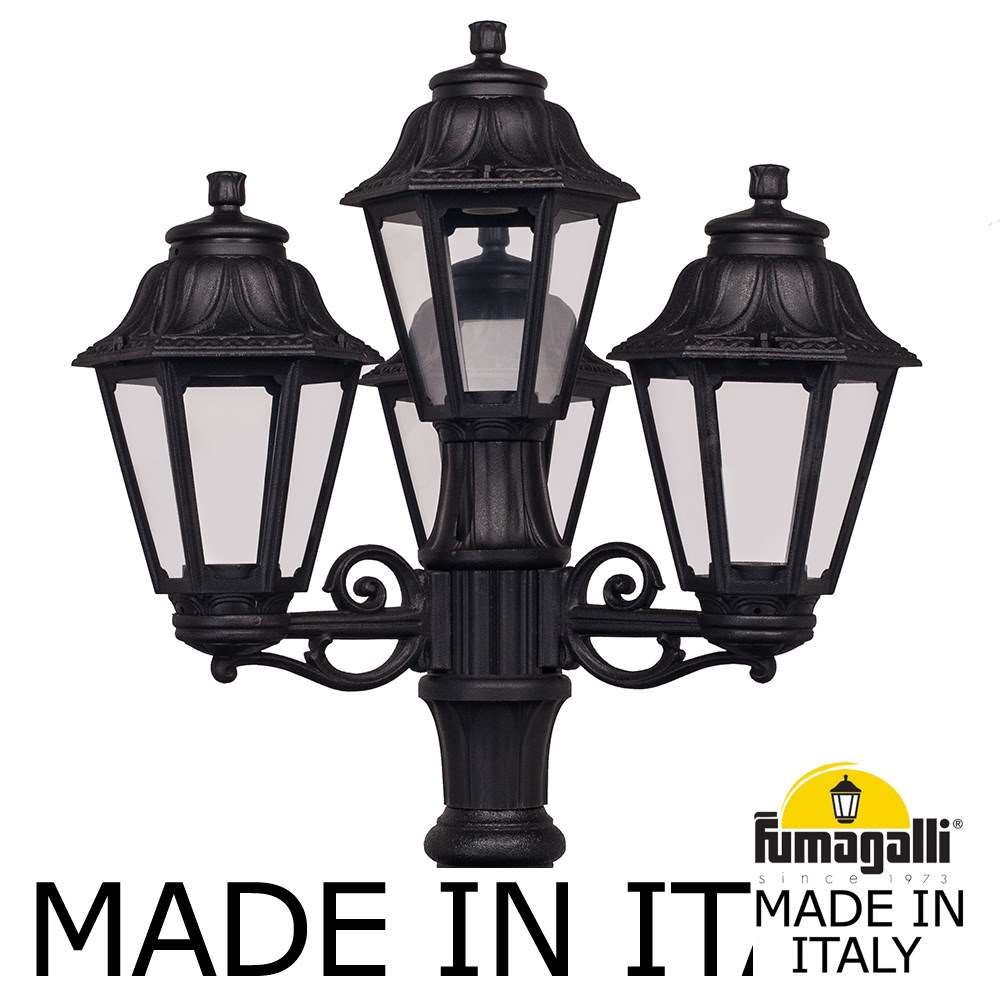 Садово-парковый фонарь FUMAGALLI серии ANNA, модель ANNA/ARTU/BISSO 3+1. Парковый торшер, столб ARTU с тремя уличными фонарями ANNA на двух малых консолях BISSO и одним светильником на опоре. Используются для архитектурного и ландшафтного освещения в стиле "классика". Место установки столбиков освещения - парковые дорожки, cкверы, садовые участки, тротуары, а так же ландшафтные и архитектурные объекты. Могут устанавливаться и внутри помещений в качестве декоративных уличных фонарей. Изготовлены в Италии, по уникальным технологиям "FUMAGALLI" из современного композитного полимера RESIN. Этот материал в 5 раз прочнее металла, не ржавеет, не окисляется, не выгорает на солнце, его не нужно красить. Все светильники пыле-влаго защищены по стандарту IP55 (защита от пыли, защита от струй воды, падающих под любым углом). Рассеиватель выполнен из антивандального, не мутнеющего и не горючего PMMA (ПолиМетилМетаАкрилат). Срок службы светильника - не менее 20 лет. Температура использования от -60 до +90. В серии ANNA есть фонари в настенном (BISSO/ANNA, PORPORA/ANNA) подвесном (SICHEM/ANNA, SICHEM/ANNA 3L) и наземном исполнении (IAFAET.R/ANNA, ALOE.R/ANNA, ARTU/ANNA, GIGI/ANNA, RICU/ANNA, RICU/ISSO/ANNA 1L, RICU/ISSO/ANNA 2L, RICU/ISSO/ANNA 3L) со столбами разной высоты, с разным количеством и конфигурацией голов. Консоли настенных фонарей и кронштейны светильников на столбах освщения могут устанавливаться вверх/вниз. Столбы выше 150 см имеют в основе мощную стальную трубу с двойной оцинковкой. При заказе требуется выбрать цвет корпуса, цвет плафона и тип патрона (Е-27 или LED GX-53). Возможен светодиодный вариант. По стилю и дизайну серия уличных светильников ANNA похожа на светильники среднего размера серии RUT и на светильники большого размера серии NOEMI. По размеру ANNA относится к малым светильникам как серия SABA и GLOBE 250.