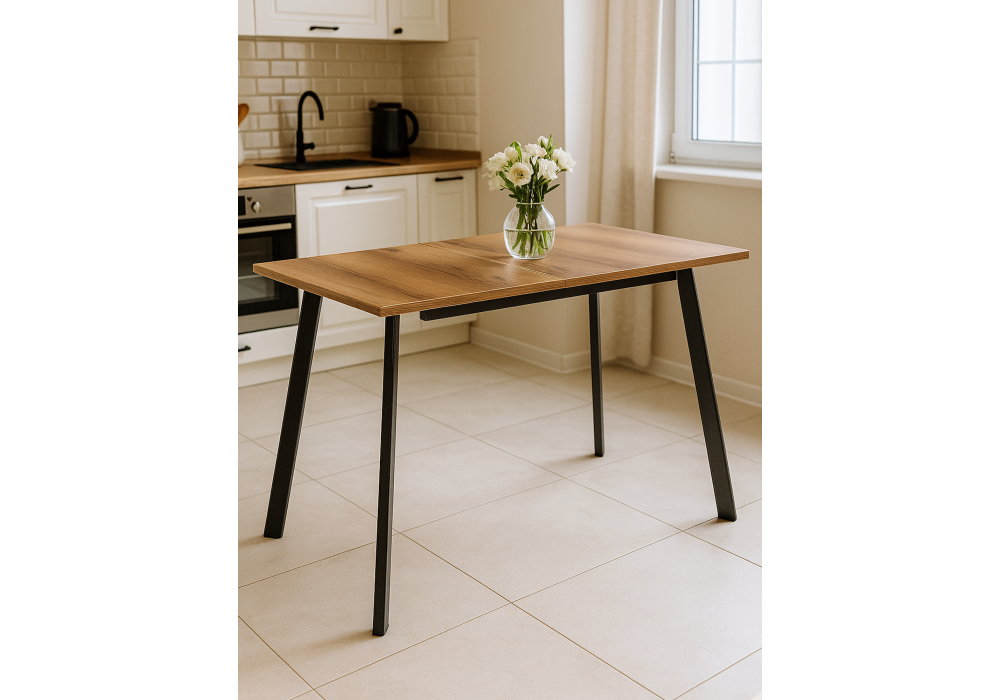 Толщина столешницы: 25 мм. Материал каркаса - металл; Материал столешницы - ЛДСП; Цвет ножек - черный; Цвет столешницы - дуб делано темный; Ширина - 75; Высота - 75; Длина стола в разложенном виде - 160; Длина - 120;