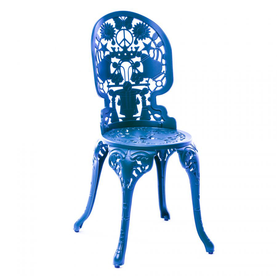 Стул из коллекции Industry, синего цвета из литого алюминия. Романтические и неподвластные времени формы классической викторианской садовой мебели. Максимальное представление стиля Pop, разработанного Студией Job. Более классическая садовая мебель теперь модная и яркая, настоящее дизайнерское произведение искусства.