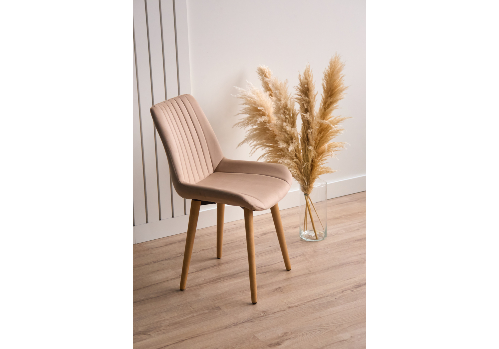 Материал каркаса - дерево; Материал сиденья - велюр; Материал обивки - велюр; Цвет ножек - натуральный; Ширина - 50; Глубина - 56; Высота - 82; Ширина сиденья - 47; Глубина сиденья - 42; Высота сиденья - 48;