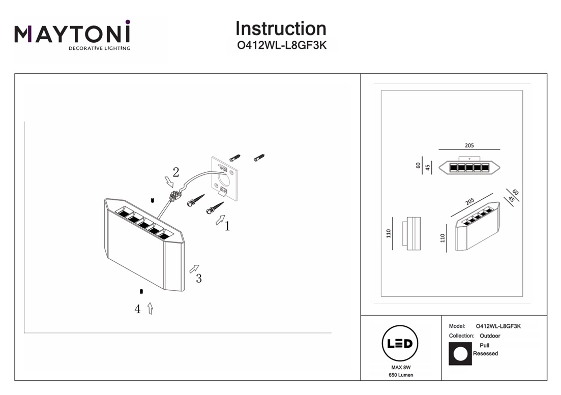 Алюминиевая арматура в форме ромба, окрашенная в темно-серый графитовый цвет, дополняет красоту прозрачного плафона в форме прямоугольника, разделенного на квадраты. Артикул имеет настраиваемый световой поток вверх и/или вниз, что позволяет использовать его в качестве декоративной архитектурной подсветки. Размеры устройства составляют 205 мм х 110 мм х 60 мм, что позволяет легко интегрировать его в любое пространство. Модели, входящие в коллекцию Pull O412WL, идеально подойдут для размещения в зоне фасада, входной группы, сада, террасы, веранды, оформленных в современном стиле, а также в любой части придомовой территории, позволяя использовать один или несколько в тандеме источников света.