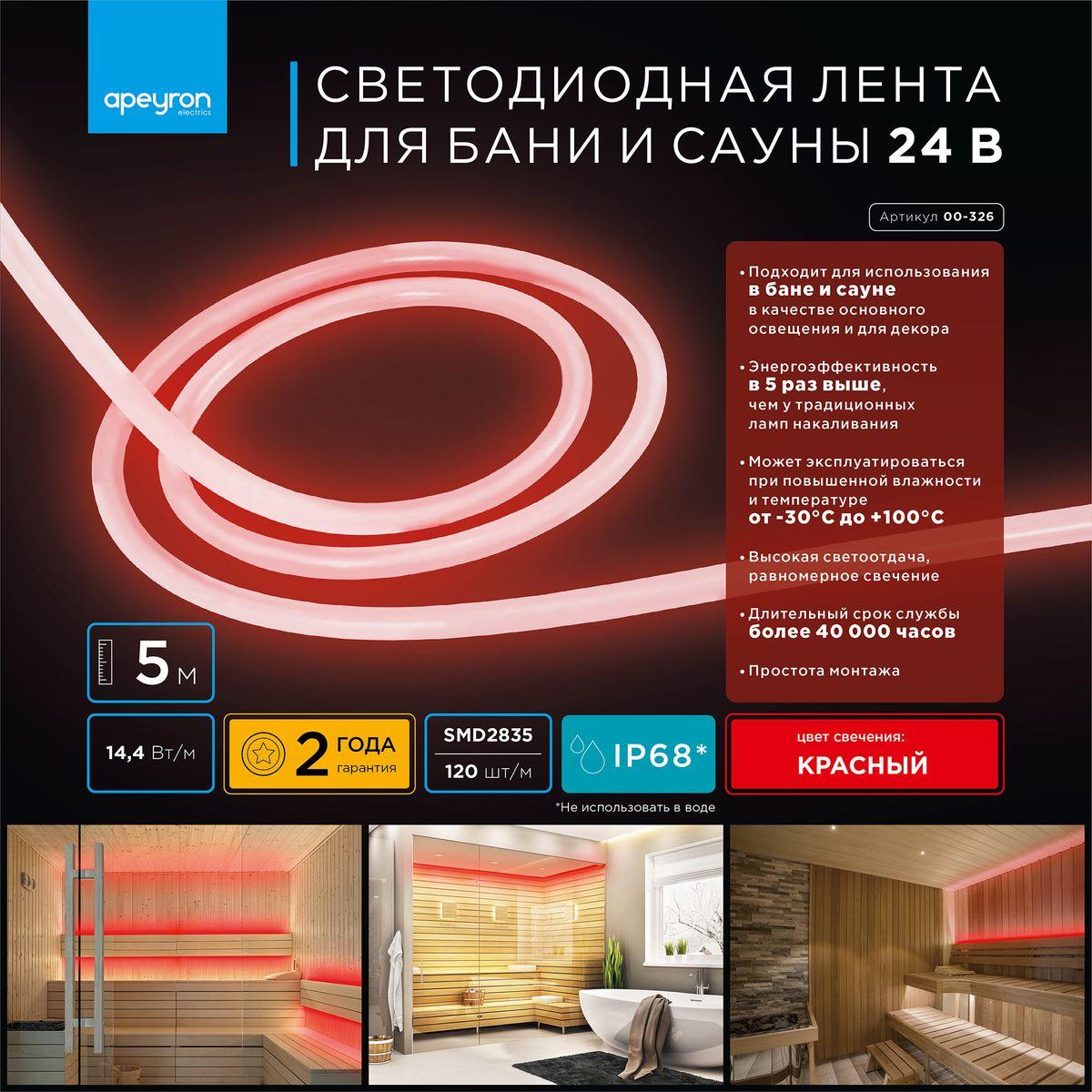 Влагозащищенная лента Apeyron 14, 4W/m 120LED/m 2835SMD красный 5M 00-326 в Оренбурге