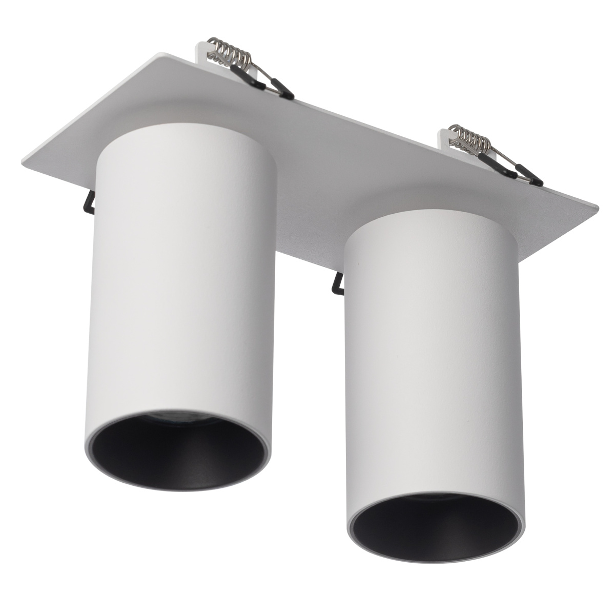 Корпус модели металлический, стильного белого оттенка. Плафоны цилиндрической формы имеют поворотное крепление, позволяющее менять направление светового луча. Источником света служат две светодиодные лампочки с цоколем GU10 мощностью не более 10Вт, встраиваемый тип крепления. Плафоны вращаются независимо друг от друга, что дает возможность формировать разный рисунок света.