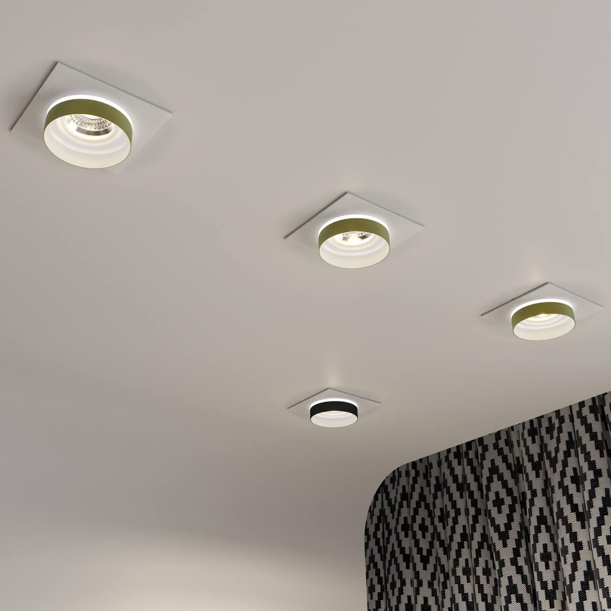 Квадратный встраиваемый светильник с арматурой белого цвета и круглым плафоном с золотой окантовкой вокруг лампы.